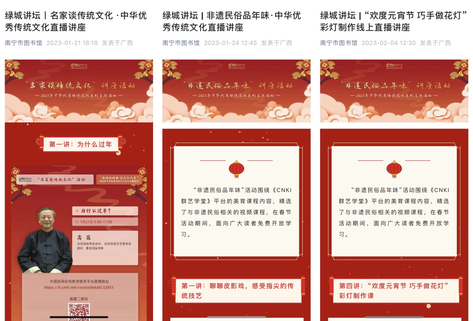 活动期间,“绿城讲坛”精选国图讲坛春节文化知识的视频资源,在馆内三楼音乐图书馆播放“书墨飘香 悦享新年”系列讲座16场,内容包括《年三十的皇家团圆饭》《大年初一的素馅饺子》《正月里的风雅:君臣饮茶作诗宴》《烟火晚会:圆明园里闹元宵》等;与中国知网共同合作,在线上推出“名家谈传统文化”“非遗民俗品年味”两个系列直播讲座7场,邀请名家名师讲述《为什么过年》《兔年说兔儿爷》《中国岁时第一节日的传统符号——年画》《聊聊皮影戏,感受指尖的传统技艺》《盘中有好戏,揭秘鬃人艺术的独特魅力》《围炉品茶,是最好的团圆:这些茶习俗你知道吗?》《“欢度元宵节 巧手做花灯”彩灯制作》等充满年味儿的内容。一场场干货满满的文化知识讲座让广大读者在新春正月里收获满满。