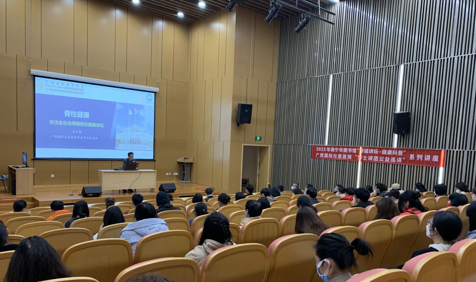 为进一步加深交流合作,实现优势互补共同发展,2023年,广西国际壮医医院“博士讲团公益巡讲”活动携手南宁市图书馆“绿城讲坛”公益讲座品牌,面向广大市民群众推出健康科普系列讲座活动。首期博士讲团活动由医学博士张文捷带领团队走进南宁市图书馆,于2023年2月17日下午为图书馆和物业公司全体干部职工带来“关注全生命周期骨骼健康”主题讲座。