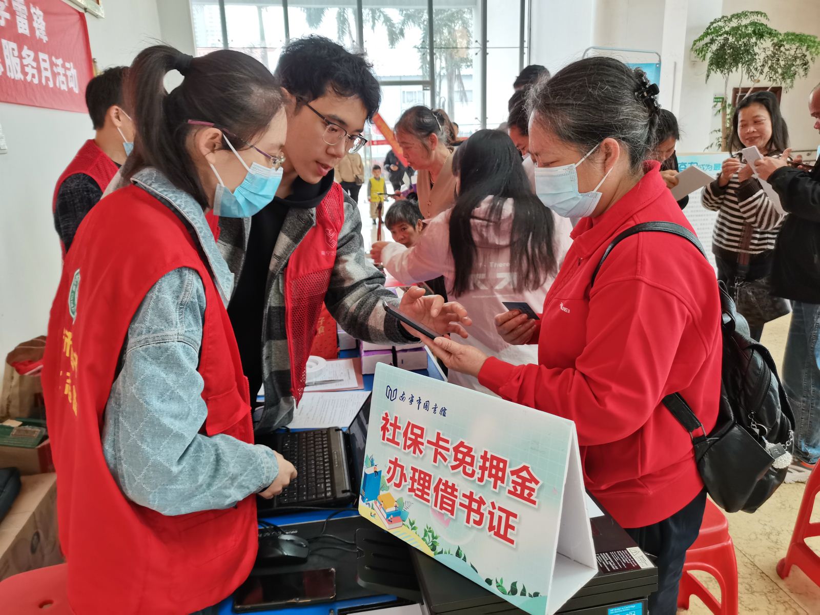 与此同时,文化志愿服务队在活动中心大厅开展“绿城闪耀志愿红·文明实践学雷锋”志愿服务活动。志愿者们在大厅中布置了“绿城展廊·让免疫力成为最好的医生”健康知识科普展,科普健康知识;面向周边社区居民群众开展免费打印复印、电子图书免费下载、公共图书馆免费开放服务宣传和图书漂流等活动;市民群众可以在现场使用社保卡免押金办理借书证,借阅汽车图书馆上的图书。此外,文化志愿服务队还准备了“学习党的二十大精神”有奖答题和垃圾分类有奖答题活动,居民们热情高涨,答题处排起长队,奖品很快就被赢取一空,现场气氛火热,一片欢声笑语。