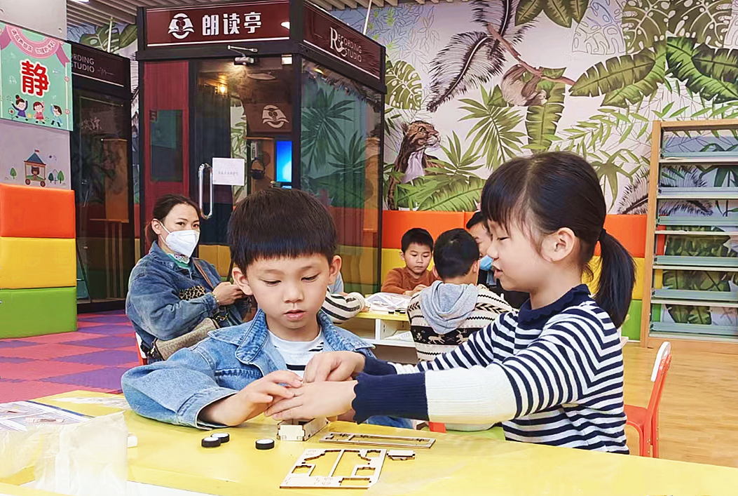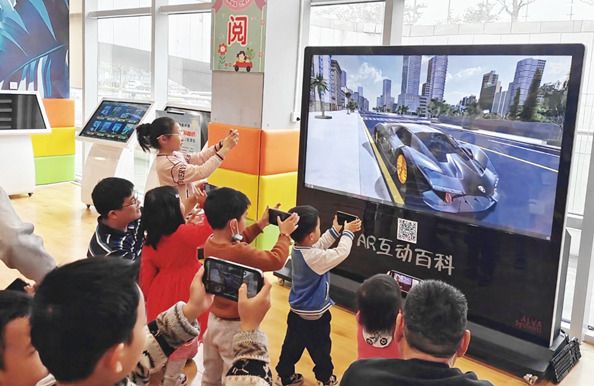 本次活动通过专业老师图文并茂的讲解和智能化“AR互动百科”大屏展示向小读者们详细介绍了汽车知识,引领小读者走进汽车世界,探秘汽车百科知识。小读者和家长通过手机端APP把汽车“捕捉”到手机中带回家并与喜欢的汽车合照留念。随后,大家一起动手制作了木质回力小车,达到了科普学习、亲子合作、知行合一的效果。虚拟数字世界和现实世界元素相融合的“沉浸式”阅读体验,激发了小读者们的阅读兴趣和想象力。
