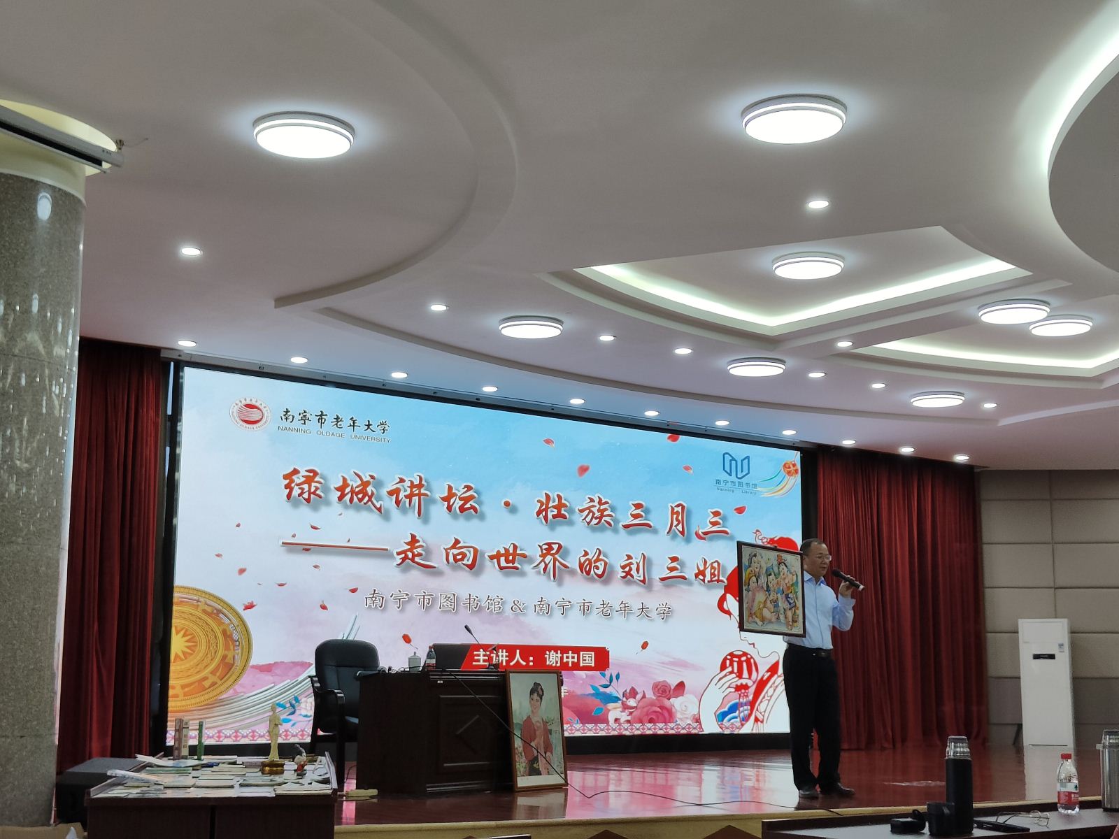 为深入贯彻党的二十大精神和习近平总书记关于加强和改进民族工作的重要思想,以铸牢中华民族共同体意识为主线,以“壮族三月三”为重要节点和重点内容,展现中华优秀传统文化和民族优秀特色文化,传播中华文明和各民族特色文化,促进民族地区文化交流,3月28日南宁市图书馆联合南宁市老年大学共同开展“绿城讲坛·壮族三月三——走向世界的刘三姐”主题活动。