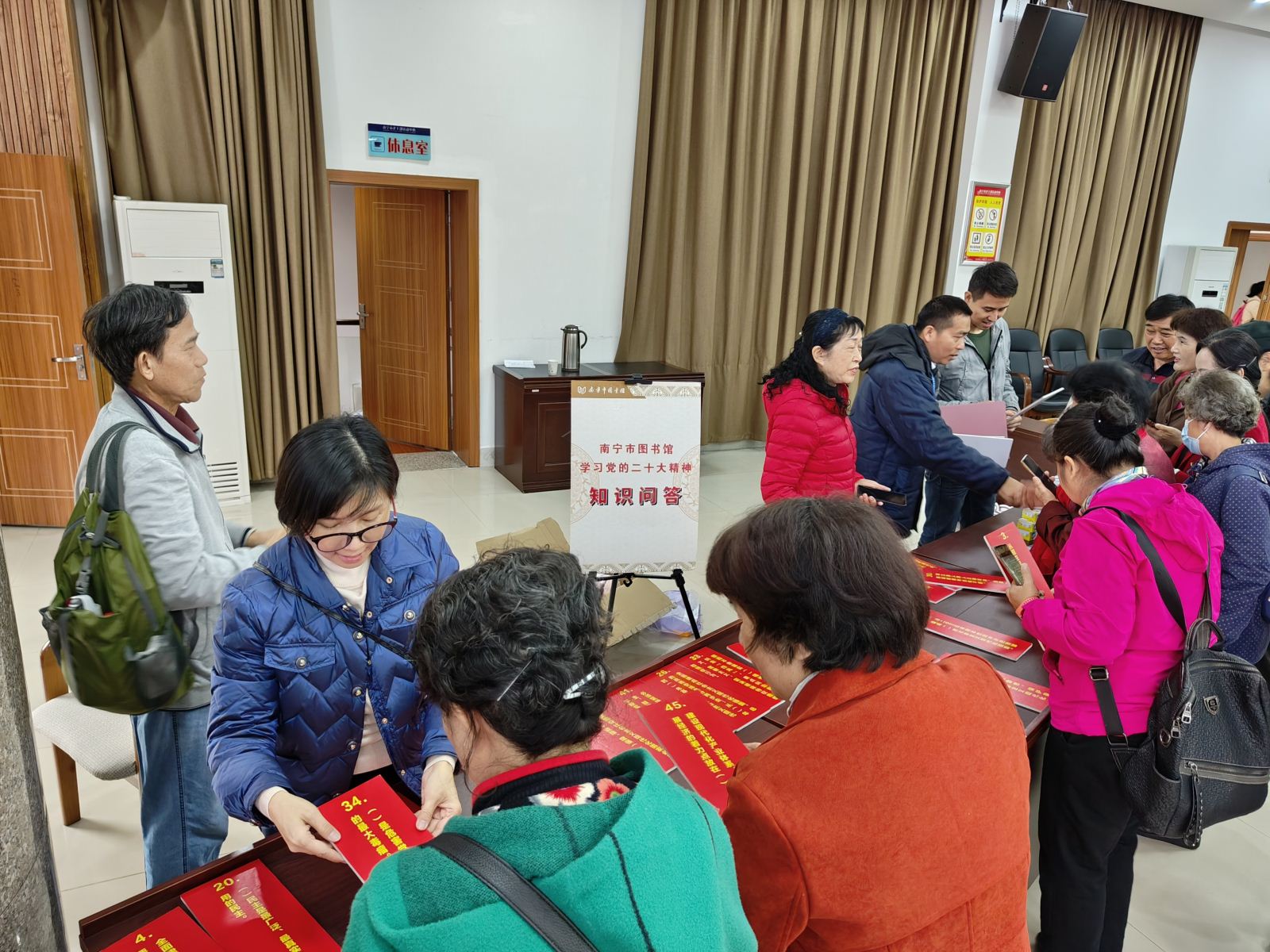 讲座结束后,老同志们积极参与南宁市图书馆举办的“学习党的二十大精神”知识问答,现场氛围活跃热烈,推动党的二十大精神深入人心、落地生根。