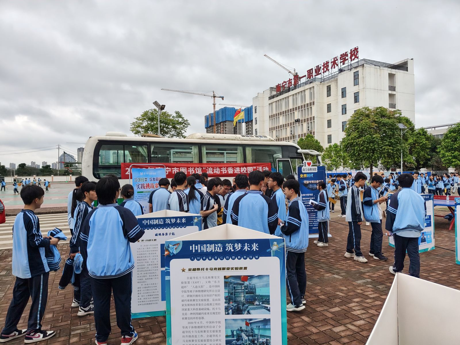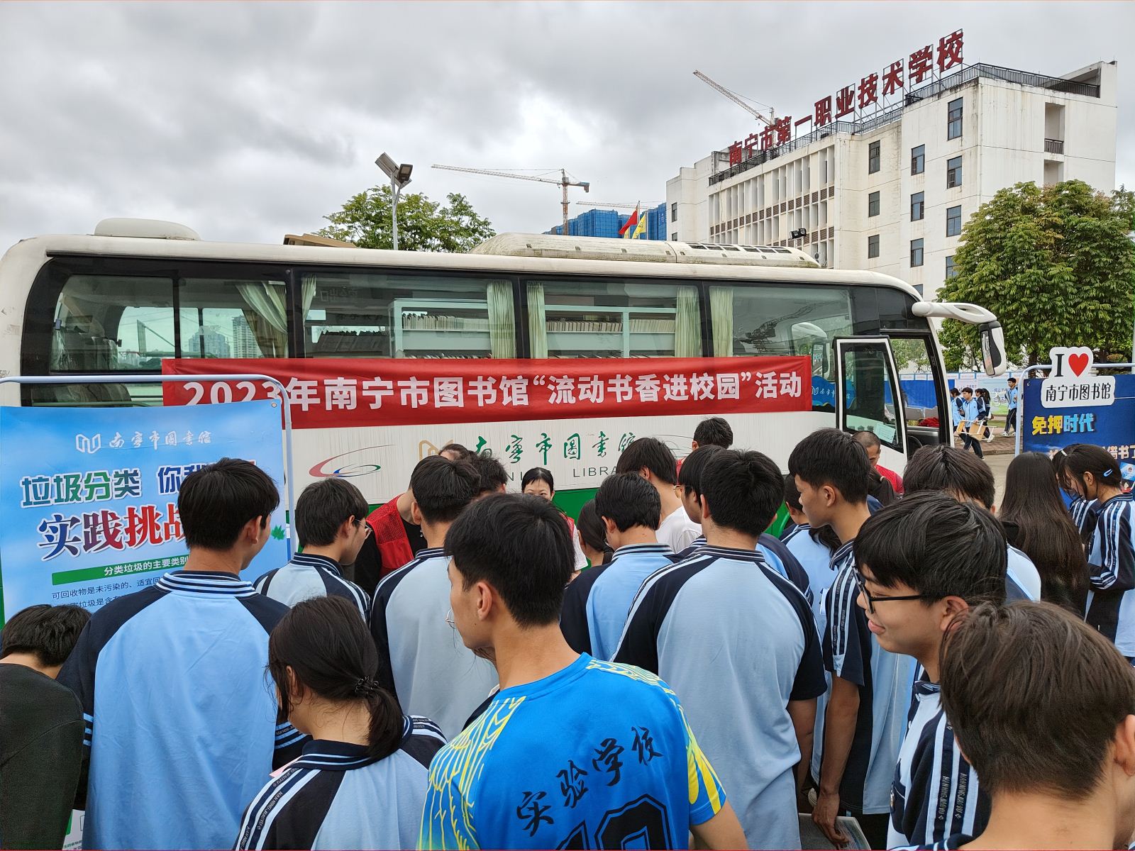 下午,南宁市图书馆流动图书车开进南宁市第一职业技术学校,为全校师生开展汽车图书馆服务,老师和学生们分批上车进行图书阅览,同学们挑选自己心仪的书籍看得津津有味,有两位同学捧起一本《旅行攻略》深入阅读,互相交流,流连忘返;在车外开展的“中国制造 筑梦未来——大国重器背后的科技创新”科普知识展吸引了不少同学的驻足观展;同时垃圾分类有奖答题、图书漂流等活动也深受欢迎,同学们大排长龙积极参与活动。