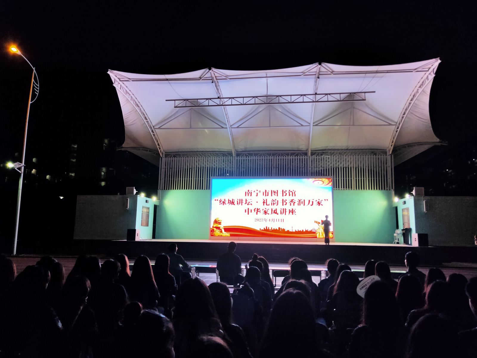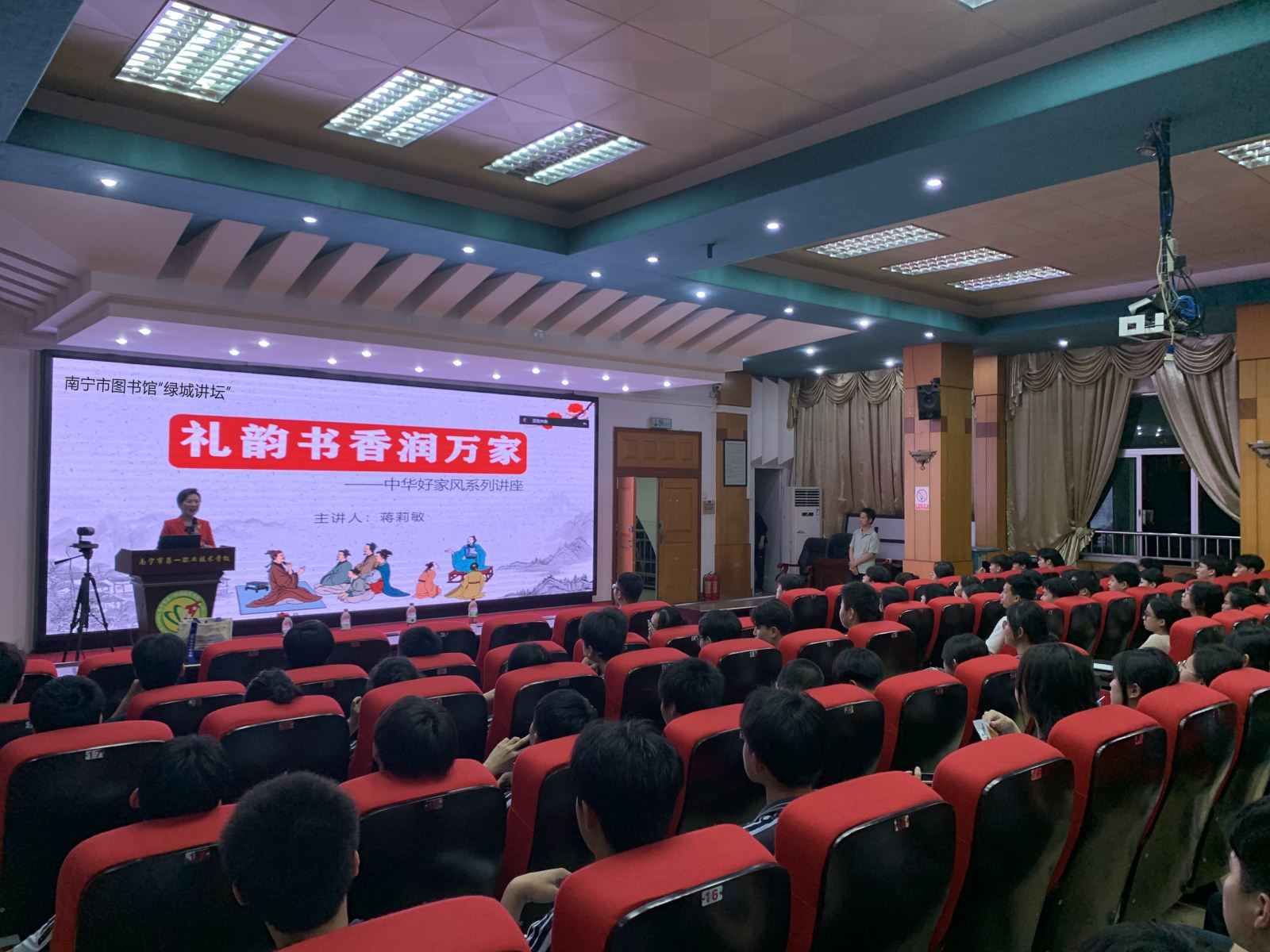 为加强习近平总书记关于注重家庭家教家风建设重要论述的学习宣传,以社会主义核心价值观引领家庭家教家风建设,升华爱国爱家的家国情怀、弘扬向上向善的家庭美德,培养孩子养成好思想、好品行、好习惯,2023年4月11日、18日,南宁市图书馆先后走进南宁市第一职业技术学校五象校区和新阳校区开展“绿城讲坛·礼韵书香润万家”中华家风讲座暨流动书香进校园活动,约3000名师生参与活动。