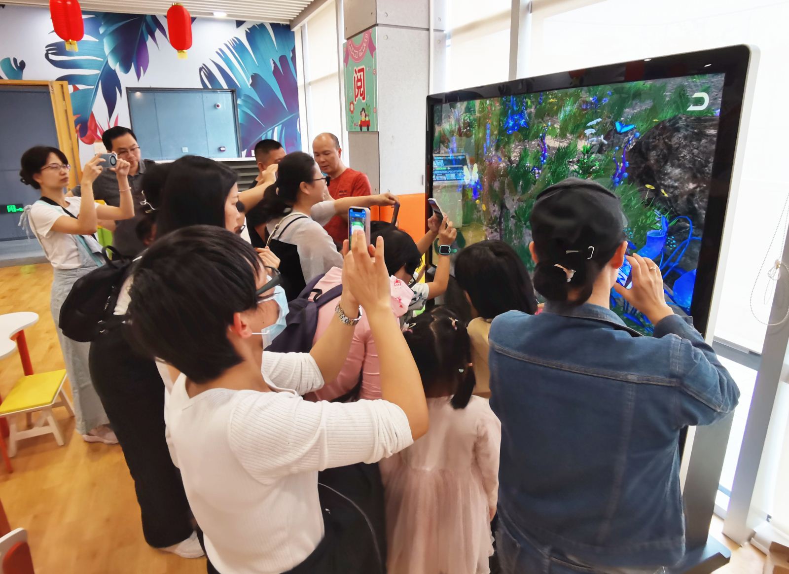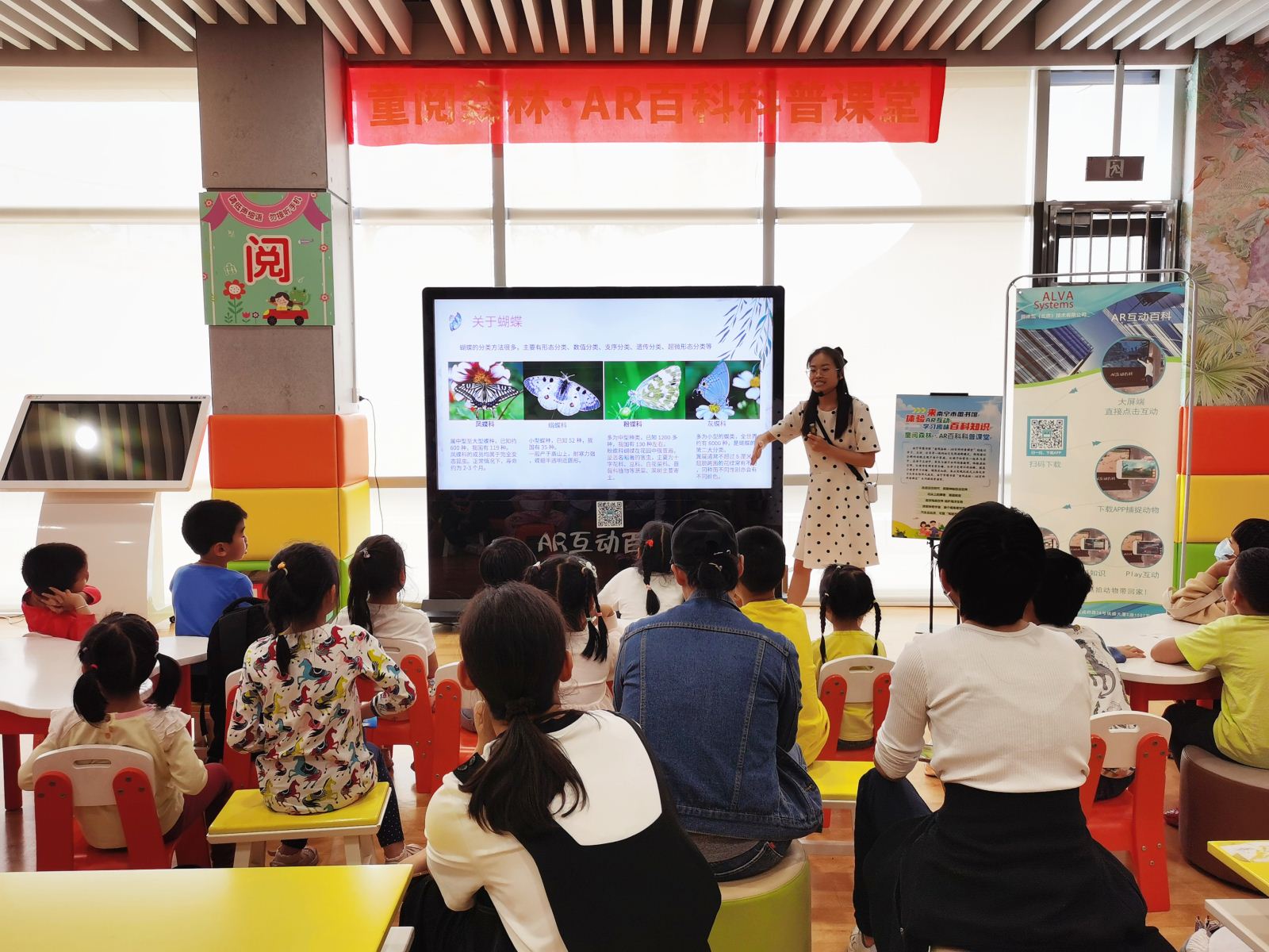 课堂上,老师从“关于蝴蝶”、“艺术‘虫’生”及“蝴蝶效应”三个方面通过专业讲解和智能化AR互动百科大屏展示引领小读者走进蝴蝶世界,共同探秘蝴蝶百科知识。小读者和家长通过手机端APP把多种多样的蝴蝶“捕捉”到手机中并与喜欢的蝴蝶合照留念。