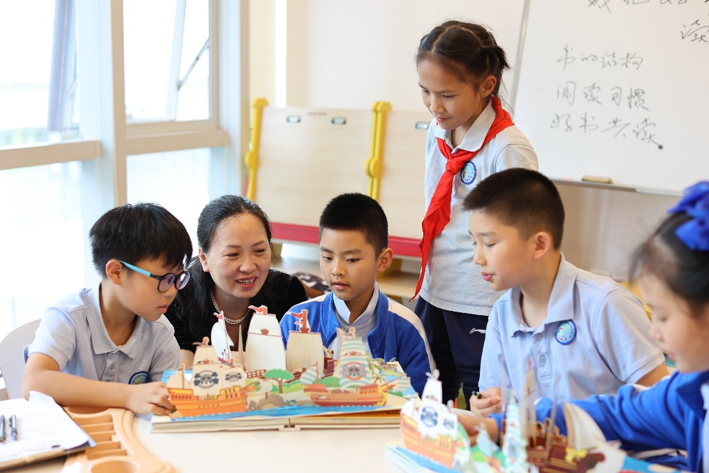 在童书阅读分享环节,黄老师为孩子们精心选读了日本插画师中垣愉孝的经典绘本故事《拆了房子造大船》,她通过提问来引导孩子们发散思维,诠释故事中的兴趣点;同时,她生动传神的讲解和表演使这则简单的故事活灵活现,孩子们聆听入神,积极互动,纷纷在故事中找到自己想要的答案。黄老师还延伸普及了船舶知识和日语发音,以此激发孩子们的探索兴趣。最后,她还展示了精美的立体书《船舶动起来》,让孩子们在近距离观摩体验中加深对船舶科普知识的理解。
