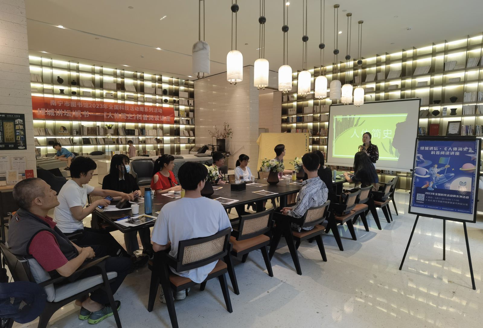 5月26日,南宁市图书馆在西园分馆举办“绿城讲坛”《人体简史》科普阅读讲座活动,特邀樊登读书翻转课堂讲师秦小萍,为读者带来一场精彩的阅读分享。这次分享围绕第十六届文津奖获奖图书《人体简史》展开,主讲嘉宾通过分组表达展示、游戏互动方式,深入浅出地解读这本比尔·布莱森引人入胜的作品,为读者们揭开人体奥秘的神秘面纱。