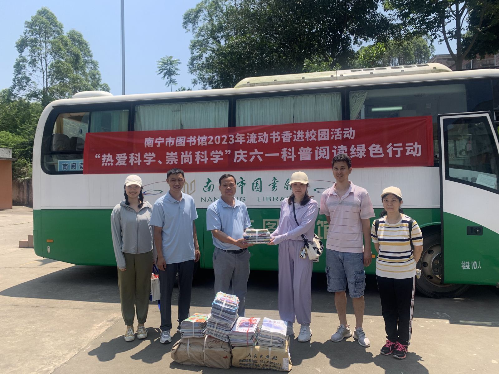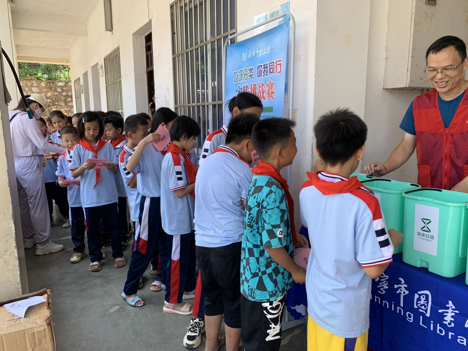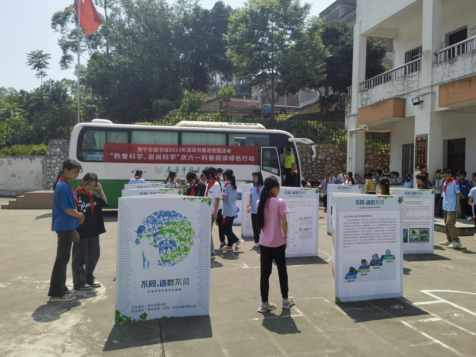 5月31日,南宁市图书馆流动图书车开进横州市平马镇丁村村委小学,以“热爱科学、崇尚科学”为主题,为小学生们开展内容丰富多彩的“庆六一”流动书香进校园活动。其中,“生物多样性保护科普展览”生动展示人类身边的丰富生命形态,引导学生们更好地认识和保护生物多样性。 “童阅种子”绘本故事会通过馆员志愿者讲述有趣的绘本故事,点燃孩子们对科学的热爱与好奇心。“乡村朗读者”全民阅读活动由我馆阅读推广人分享科普作品《八十天环游地球》,并带领学生们齐声朗读作品的精彩片段,引导孩子们了解并阅读经典的科普类图书。而禁毒科普知识有奖竞答通过题板的形式宣传禁毒重要性,让孩子们通过轻松的学习方式了解毒品危害。最受欢迎的垃圾分类实践挑战赛吸引了全校学生的积极参与,活动有效引导孩子们树立环保意识,培养阅读习惯。