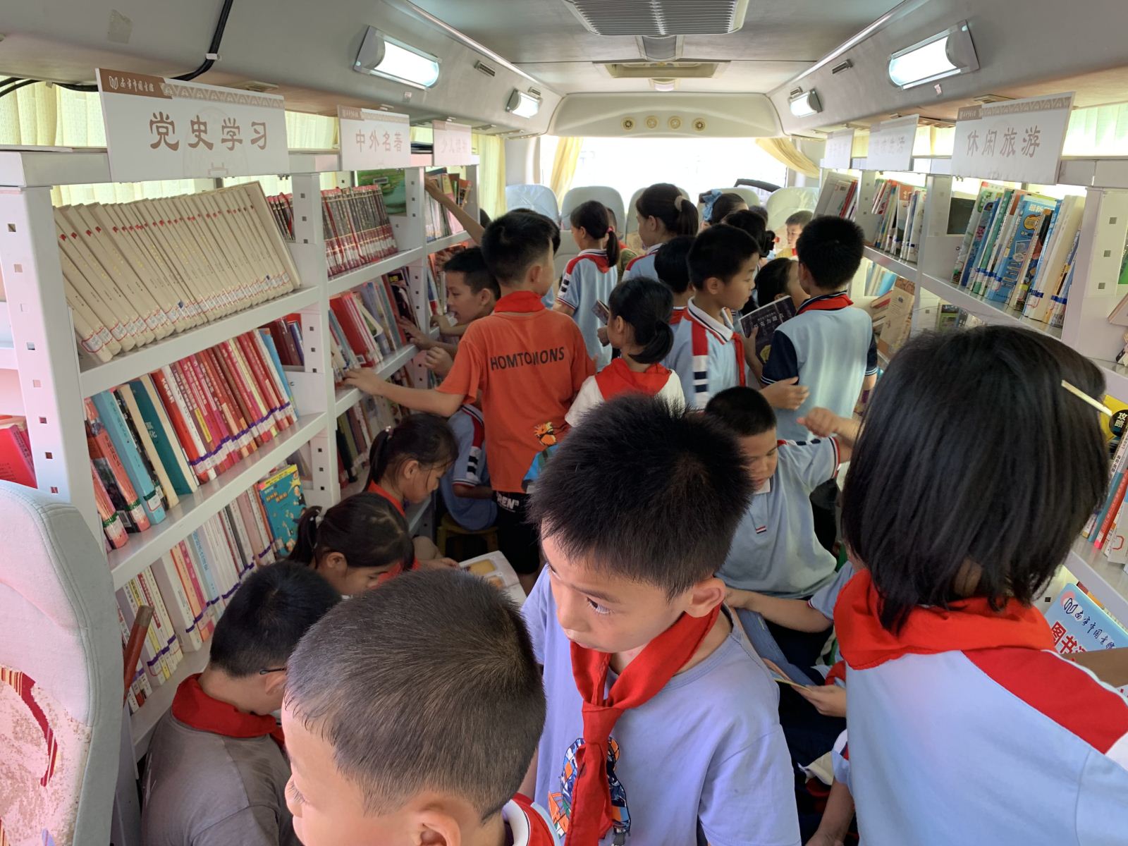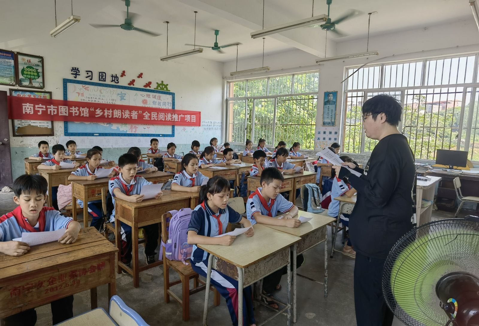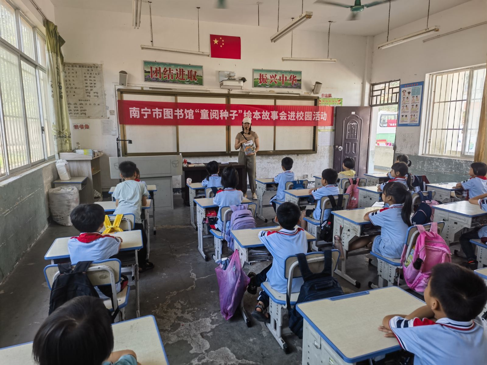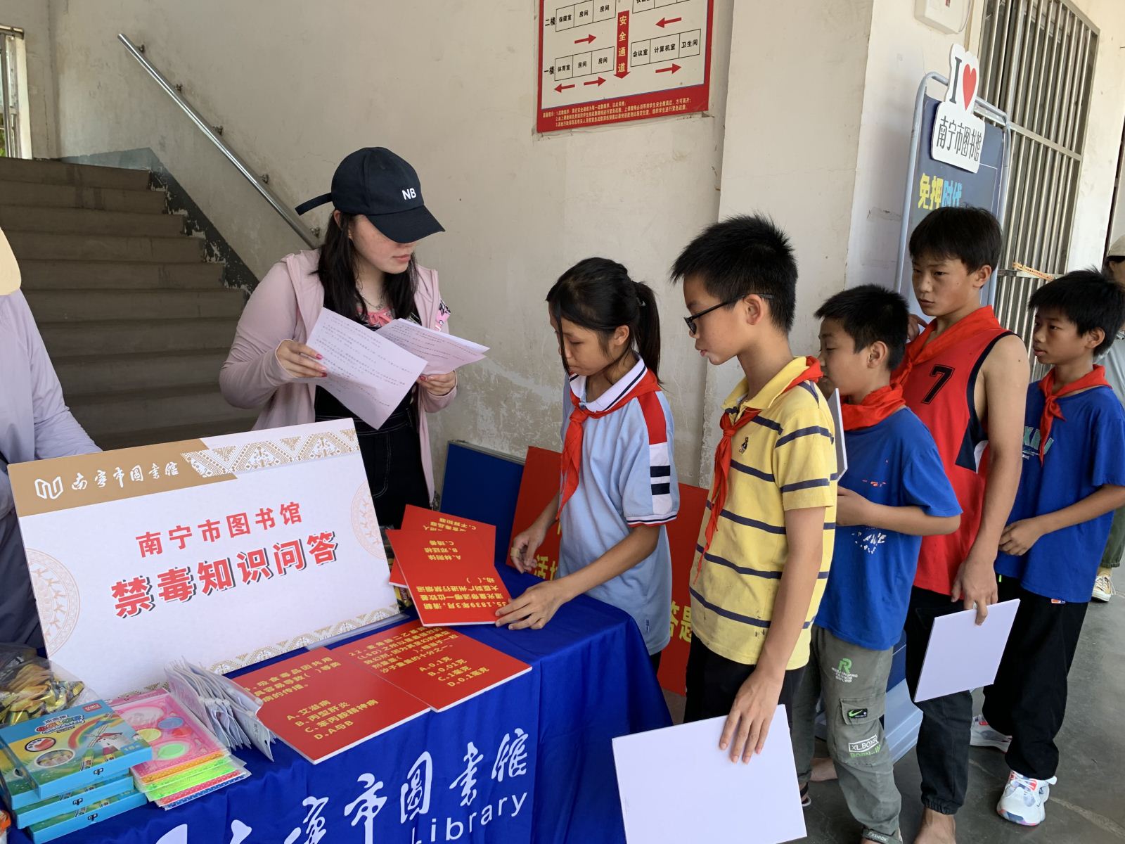 5月31日,南宁市图书馆流动图书车开进横州市平马镇丁村村委小学,以“热爱科学、崇尚科学”为主题,为小学生们开展内容丰富多彩的“庆六一”流动书香进校园活动。其中,“生物多样性保护科普展览”生动展示人类身边的丰富生命形态,引导学生们更好地认识和保护生物多样性。 “童阅种子”绘本故事会通过馆员志愿者讲述有趣的绘本故事,点燃孩子们对科学的热爱与好奇心。“乡村朗读者”全民阅读活动由我馆阅读推广人分享科普作品《八十天环游地球》,并带领学生们齐声朗读作品的精彩片段,引导孩子们了解并阅读经典的科普类图书。而禁毒科普知识有奖竞答通过题板的形式宣传禁毒重要性,让孩子们通过轻松的学习方式了解毒品危害。最受欢迎的垃圾分类实践挑战赛吸引了全校学生的积极参与,活动有效引导孩子们树立环保意识,培养阅读习惯。