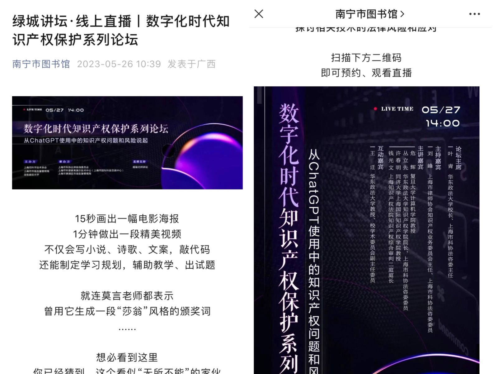 为了更广泛地普及科学知识,南宁市图书馆还推出了一系列线上活动。其中,由国家图书馆联合全国公共图书馆依托“网络书香 阅见美好”微信小程序特别推出的“古今相映,畅游科技之旅”科技周专题数字阅读推广活动非常值得关注。通过数字化的方式,读者们能够亲身体验古代科技与现代科技的交融之美,探索科技的无限魅力。“绿城讲坛·线上直播丨数字化时代知识产权保护系列论坛”则专注于探讨数字化时代的知识产权保护,以热门话题“CHATGPT”为例子,邀请权威专家深入剖析数字化时代知识产权保护面临的挑战与机遇。通过线上直播的形式,参与者可以深入了解知识产权保护的重要性,促进科技创新和社会进步。