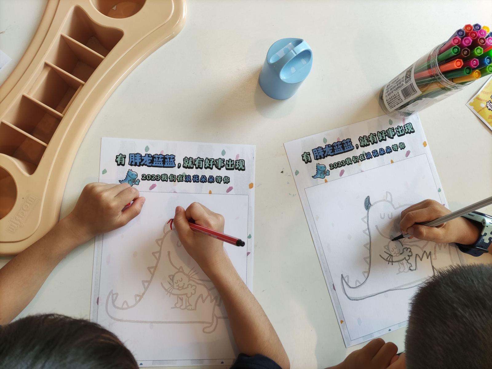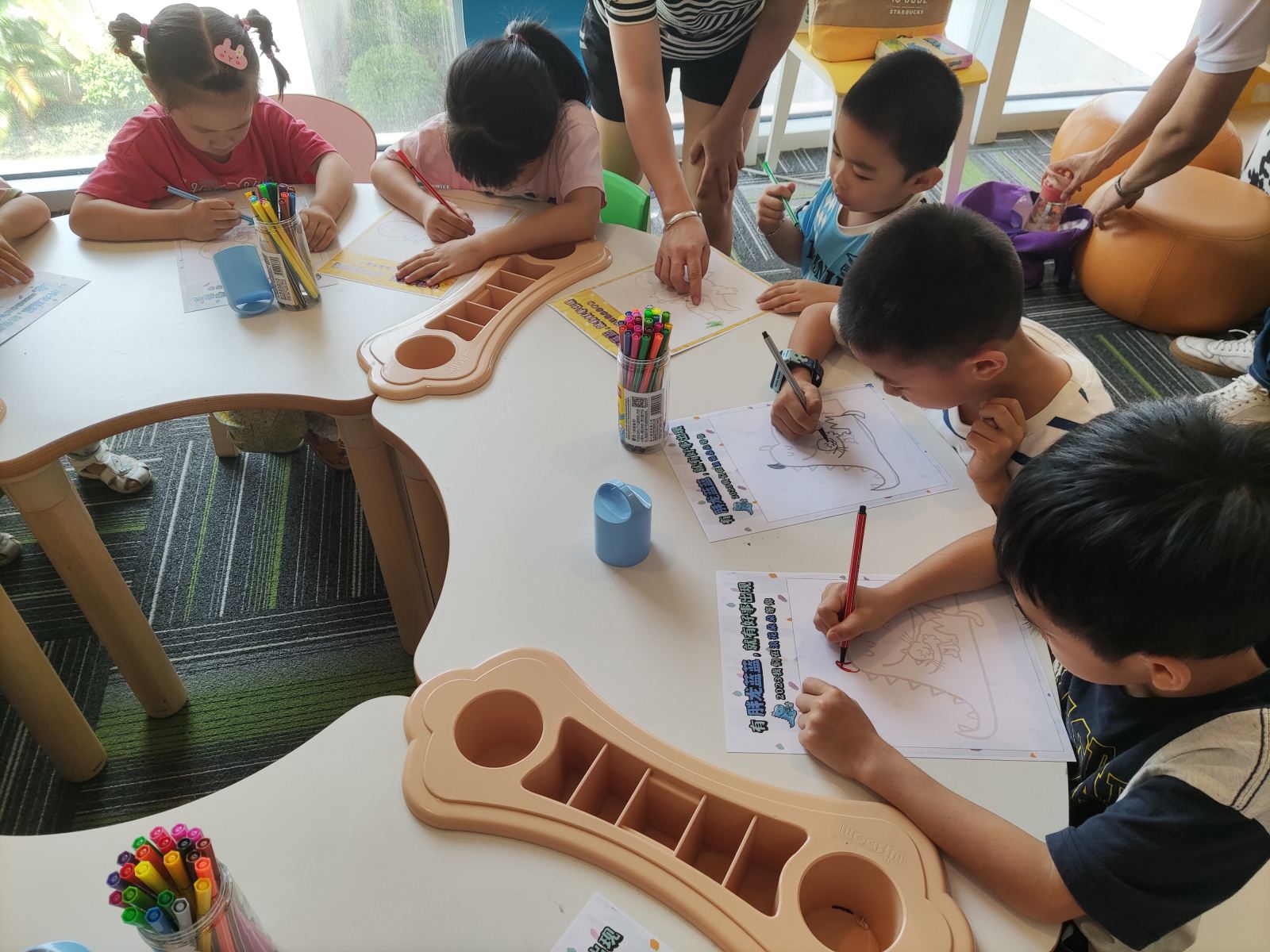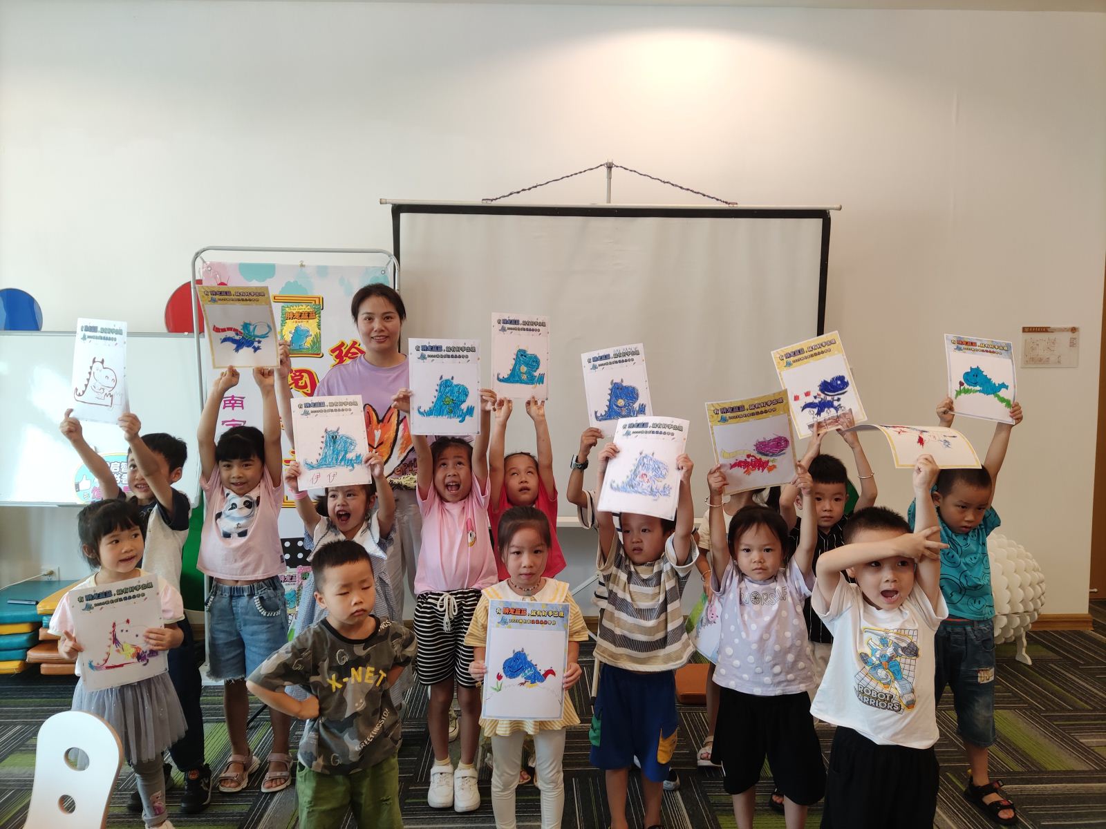活动中,蔷薇老师首先通过欢快的小游戏与小读者们热情互动,充分调动小读者们的情绪,活跃现场气氛,通过游戏的方法逐渐引出这次绘本的主角——胖龙蓝蓝,用夸张丰富的肢体语言和周围环境有效结合,把胖龙蓝蓝迷糊的一天生动形象地演绎出来,在场的小读者无一例外地都被老师声情并茂讲述所深深吸引,面对老师的提问积极响应,整个教室充满着欢声笑语。小读者们还一起进行创意绘画,把各自对胖龙蓝蓝的理解和想象用画笔勾勒出来,填涂自己独一无二的色彩,绘画出属于自己心中的胖龙蓝蓝。