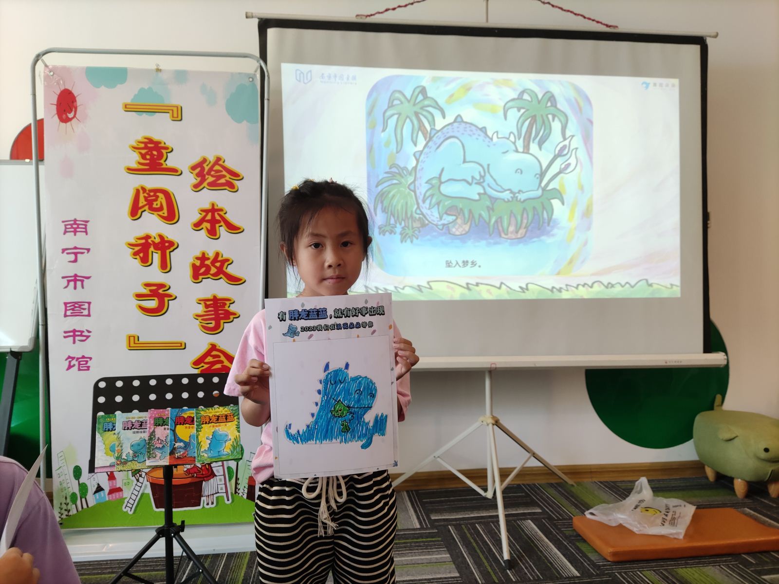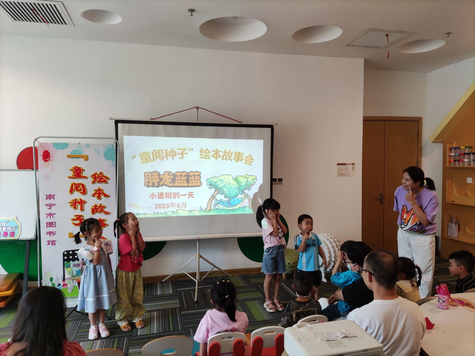 为积极推进儿童友好图书馆建设,认真履行阅读推广职责,帮助小读者家庭提升阅读兴趣,养成良好亲子共读习惯,以少儿阅读带动家庭阅读,促进全民阅读,助力儿童友好城市建设,在6月11日上午南宁市图书馆邀请阅读推广人蔷薇老师做客“童阅种子”绘本故事会,和近16组亲子家庭共享《胖龙蓝蓝》系列经典桥梁书。