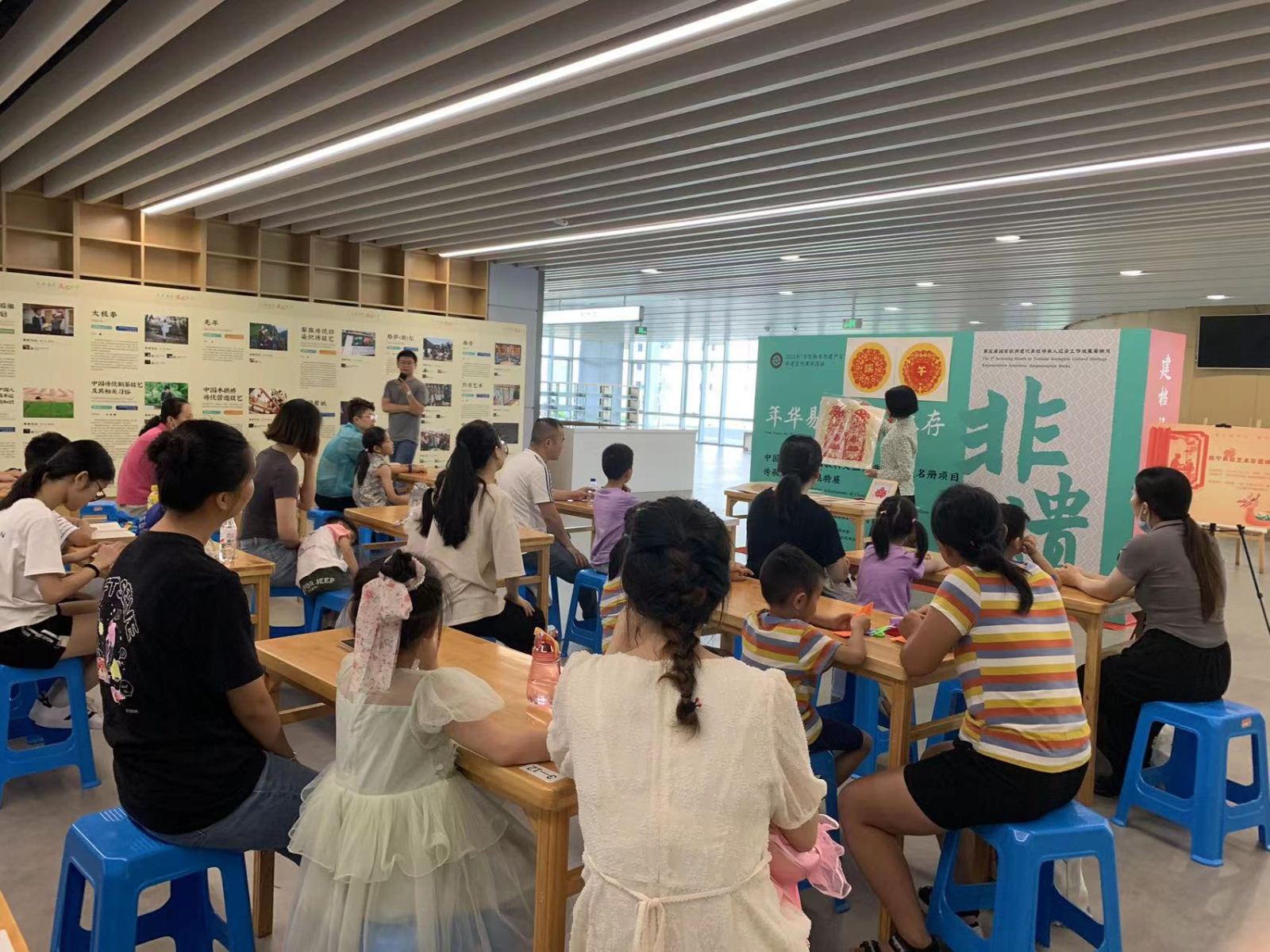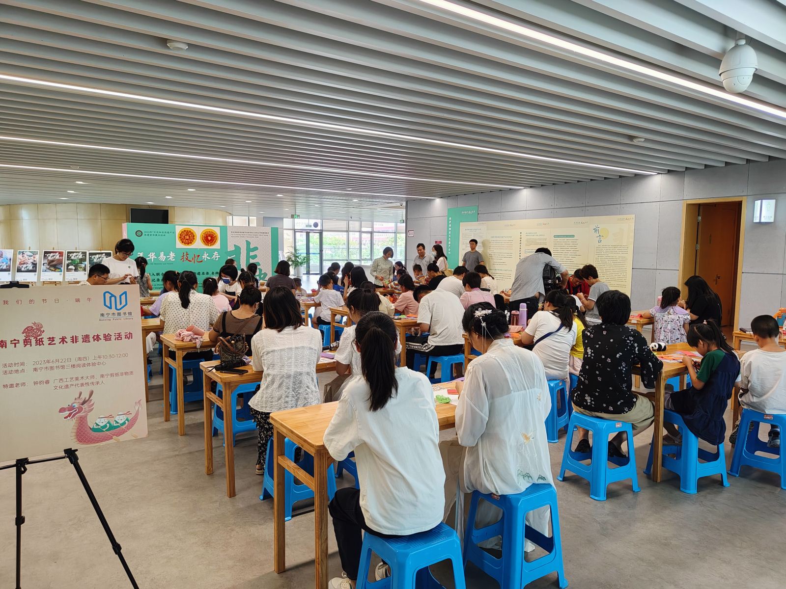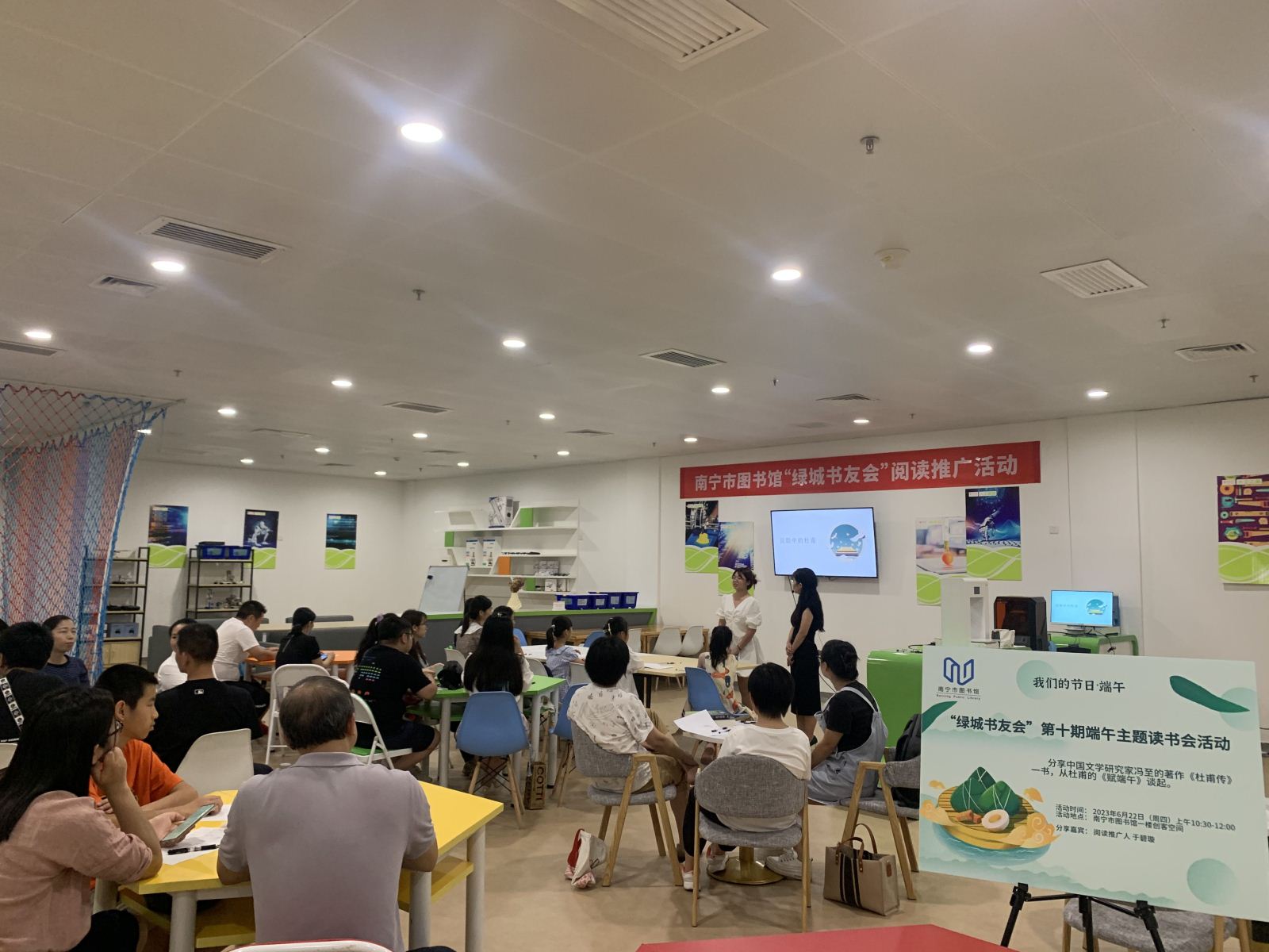 6月22日端午节当天,市图书馆热闹非凡。在三楼阅读体验中心,南宁剪纸非遗体验活动特邀广西工艺美术大师、南宁剪纸非物质文化遗产代表性传承人钟昀睿老师,带领读者朋友们共同体验非遗剪纸的艺术魅力,巧手剪纸粽,欢度端午节。在一楼创客空间开展的第十期绿城书友会活动,邀请阅读推广人于碧璇从杜甫的《赋端午》谈起,与读者分享中国文学研究家冯至的著作《杜甫传》一书,融入角色扮演和小游戏让读者了解杜甫的生平,体悟诗圣百折不回的乐观精神。此外,读者端午当天到馆拍照打卡馆内在展展览,即可在二楼服务总台领取限量100份的艾草香囊一枚,寓意着“高粽”“纳福”“平安”“如意”“开运”的观展打卡互动香囊深受读者欢迎。