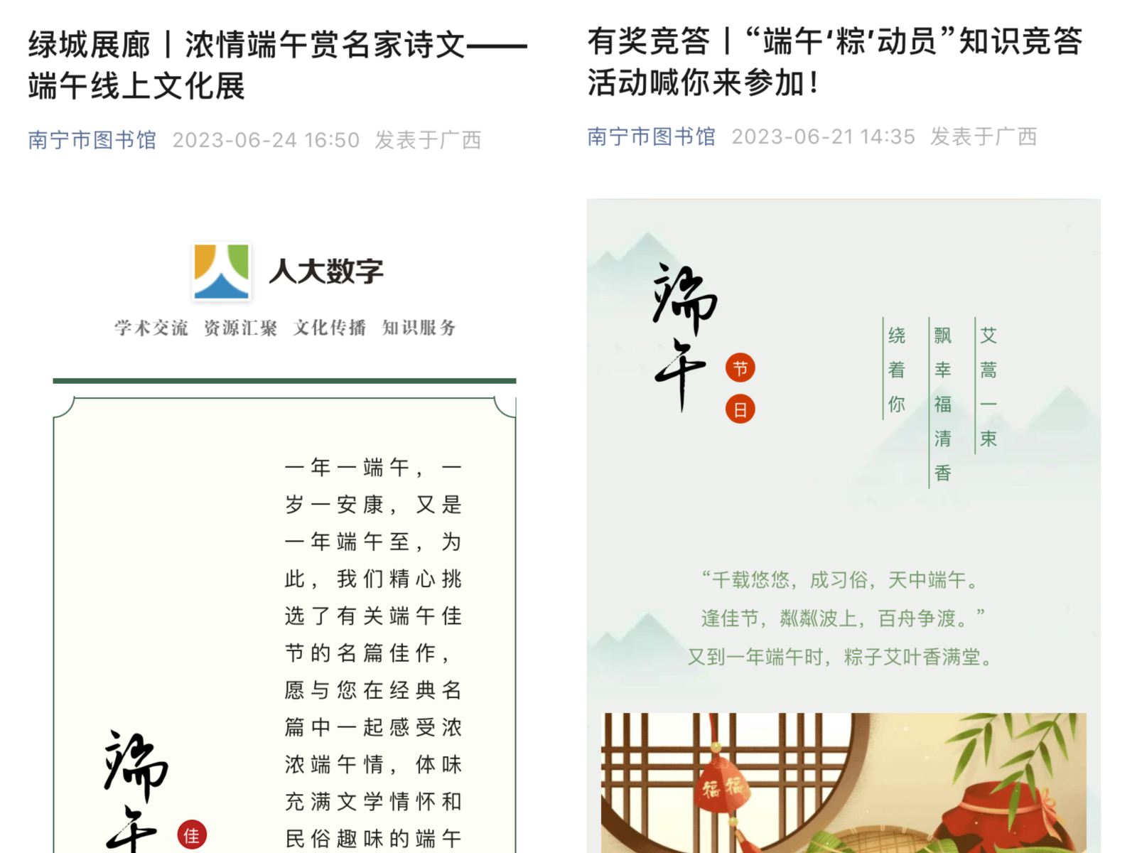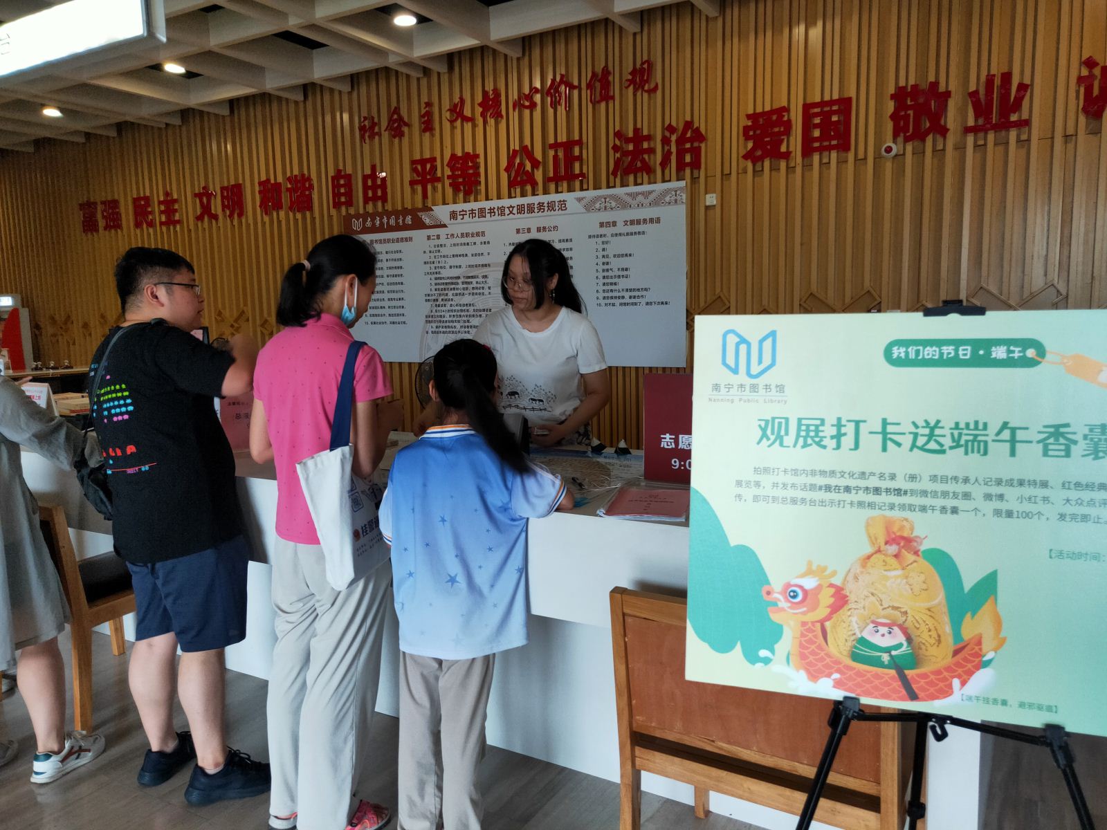 端午节作为中国首个入选世界非遗的节日,蕴含着深邃丰厚的文化内涵,自古便有吃粽子、饮雄黄、采艾叶、赛龙舟等民俗,流传至今,经久不息。在端午节期间,为了让广大读者更好地了解传统民俗文化知识,感受中华优秀传统文化的博大精深与独特魅力,南宁市图书馆特别策划推出“我们的节日·端午”阅读推广主题活动。