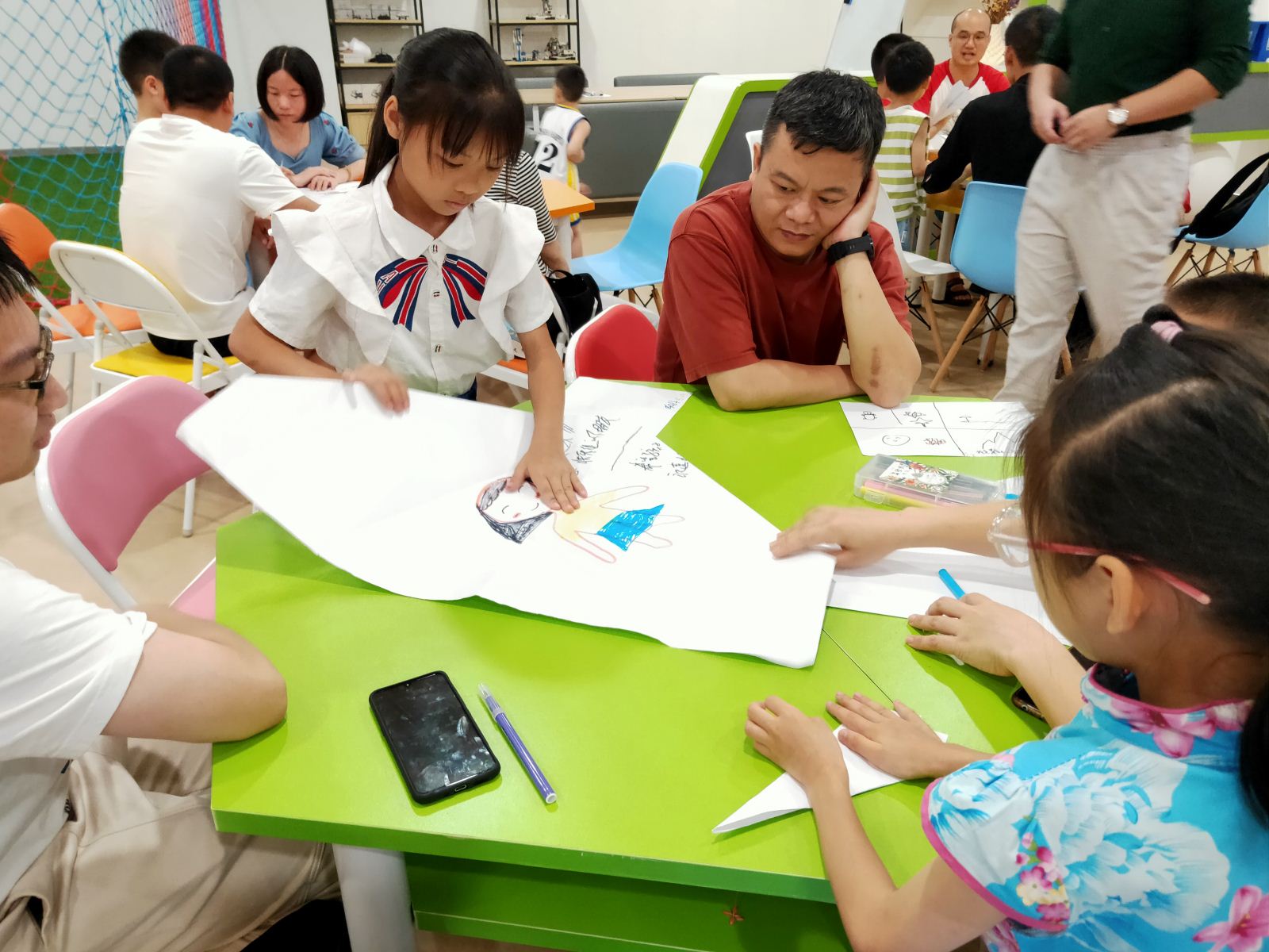 参加活动的40名读者分为6组,以在场所有父亲的一幅四象限绘画开场,画中内容为“我孩子出生的季节”“我和孩子的第一次旅行”“我眼中孩子的未来”“孩子眼中的爸爸”。绘画完成后,各组的父亲代表逐个分享自己绘画作品的含义,其中第3组的父亲希望孩子健康快乐,目前还没有和孩子一起去旅行,在孩子眼中是朋友;第6组的父亲希望孩子成为医生或者律师,第一次和孩子旅行是在海边,在孩子眼中是超人。之后进行的是绘画签名环节,哪位父亲的绘画作品上得到的签名数最多,就可得到相应积分,活动结束后积分最多的一组可获得一份精美奖品。