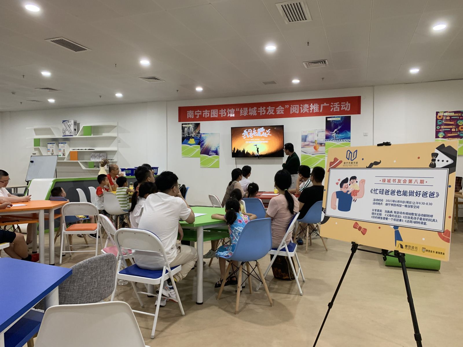由布鲁斯·罗宾森所著的《忙碌爸爸也能做好爸爸》是樊登读书创始人樊登博士的私房藏书,他将这本书推荐给所有为家庭而忙碌的爸爸妈妈们。2023年6月18日上午,在父亲节到来之际,南宁市图书馆阅读推广部在馆内一楼创客空间举办“绿城书友会”第八期活动,以“父爱如山”为主题,邀请读者朋友以家庭为单位,一起通过阅读、分享和感悟,读懂父爱,感恩父亲。