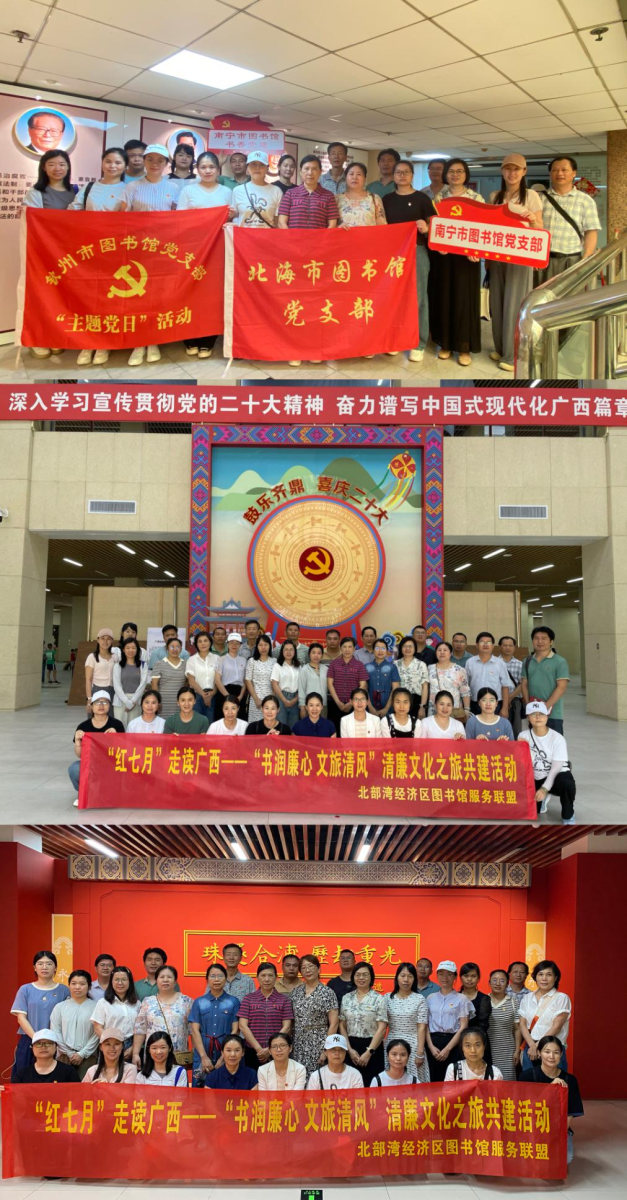 为进一步宣传贯彻落实党的二十大精神,以党建领航公共文化服务发展,北部湾经济区图书馆服务联盟成员馆南宁市图书馆、北海市图书馆、钦州市图书馆、防城港市图书馆、玉林市图书馆、崇左市图书馆、南宁市少年儿童图书馆、北海市少年儿童图书馆联合开展了支部联建活动——“红七月”走读广西“书润廉心 文旅清风”清廉文化之旅,各联盟馆派出党员代表共计39人参加。