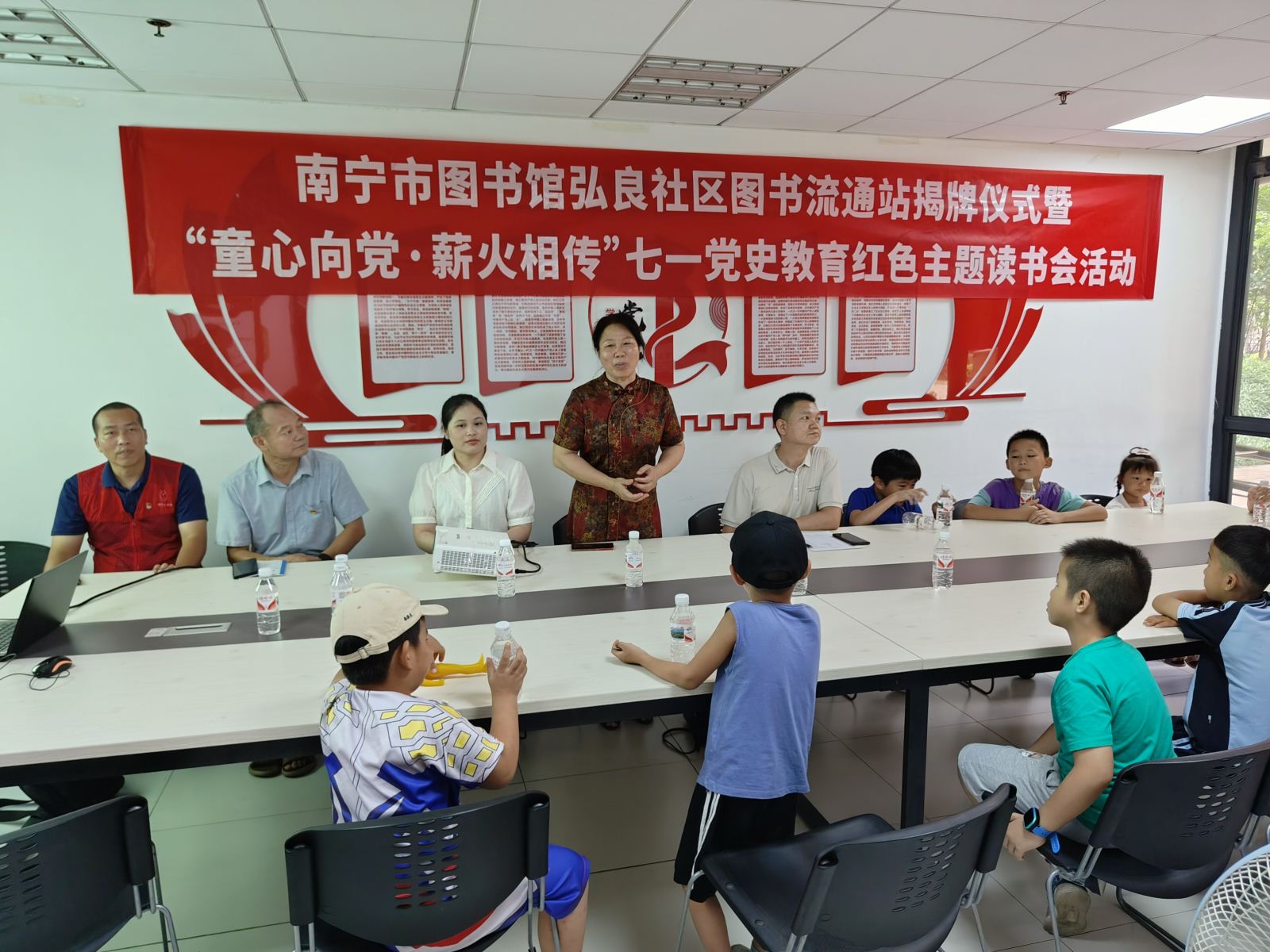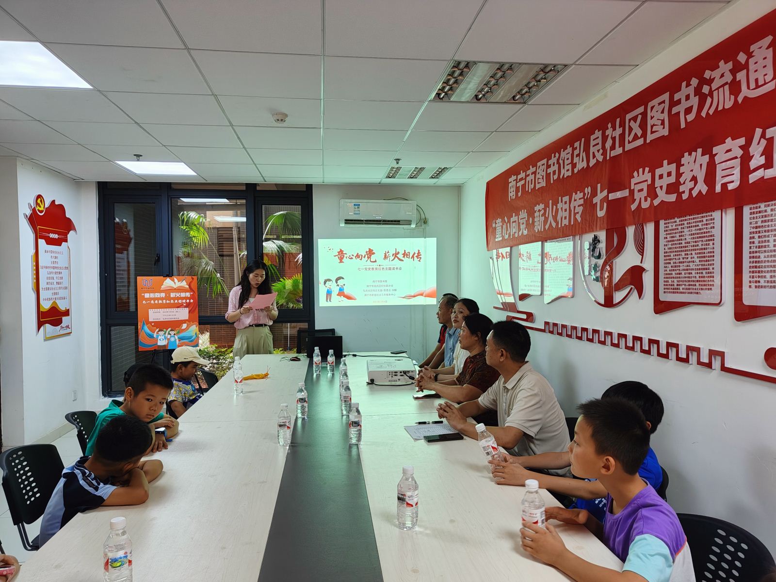 2023年7月4日,南宁市图书馆弘良社区图书流通站在良庆区天誉花园五区举行建站揭牌仪式。为庆祝中国共产党成立102周年, 利用“七一”前后时间节点深入基层开展党史学习教育,在未成年人中广泛开展革命传统教育,弘扬爱国主义,传承革命精神,南宁市图书馆阅读推广部结合图书流通站揭牌仪式,与良庆区妇联、新望社会工作服务中心、天誉花园物业共同组织开展“童心向党·薪火相传”七一党史教育红色主题读书会活动,约30名社区居民参加活动。