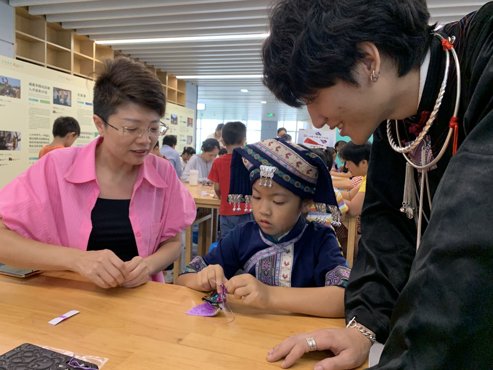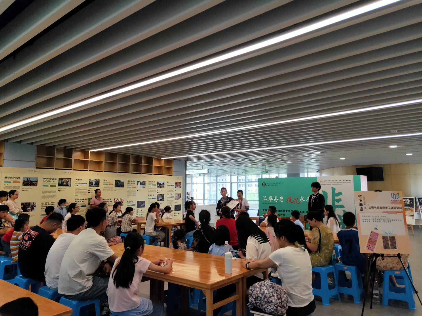 2023年7月8日上午,由南宁市图书馆主办、广西自然时光文化传播有限公司协办的“壮乡非遗”系列活动第一期——壮锦书签非遗手工体验活动在市图书馆成功举办。壮锦作为广西壮族地区最具代表性的民族手工艺品之一,以其严谨的结构、鲜明的色彩和粗犷的风格而闻名。壮锦不仅是中国四大名锦之一,更是中华民族文化的瑰宝。本次活动旨在向公众普及广西非物质文化遗产的知识,传承中华优秀传统文化,培养创新发展意识。通过专业老师讲解壮锦的历史文化和指导制作壮锦书签的手工环节,让市民读者近距离感受壮锦的独特魅力。