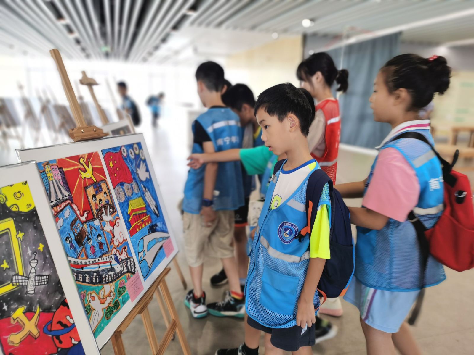 随后,馆员老师带领大家到三楼参观了“童心向党 强国复兴有我”暨第三届南宁市少年儿童公益绘画大赛优秀作品展。一幅幅饱含对党和祖国的感恩和祝福的画作展现了绿城少年儿童的精神风貌和创作水平。