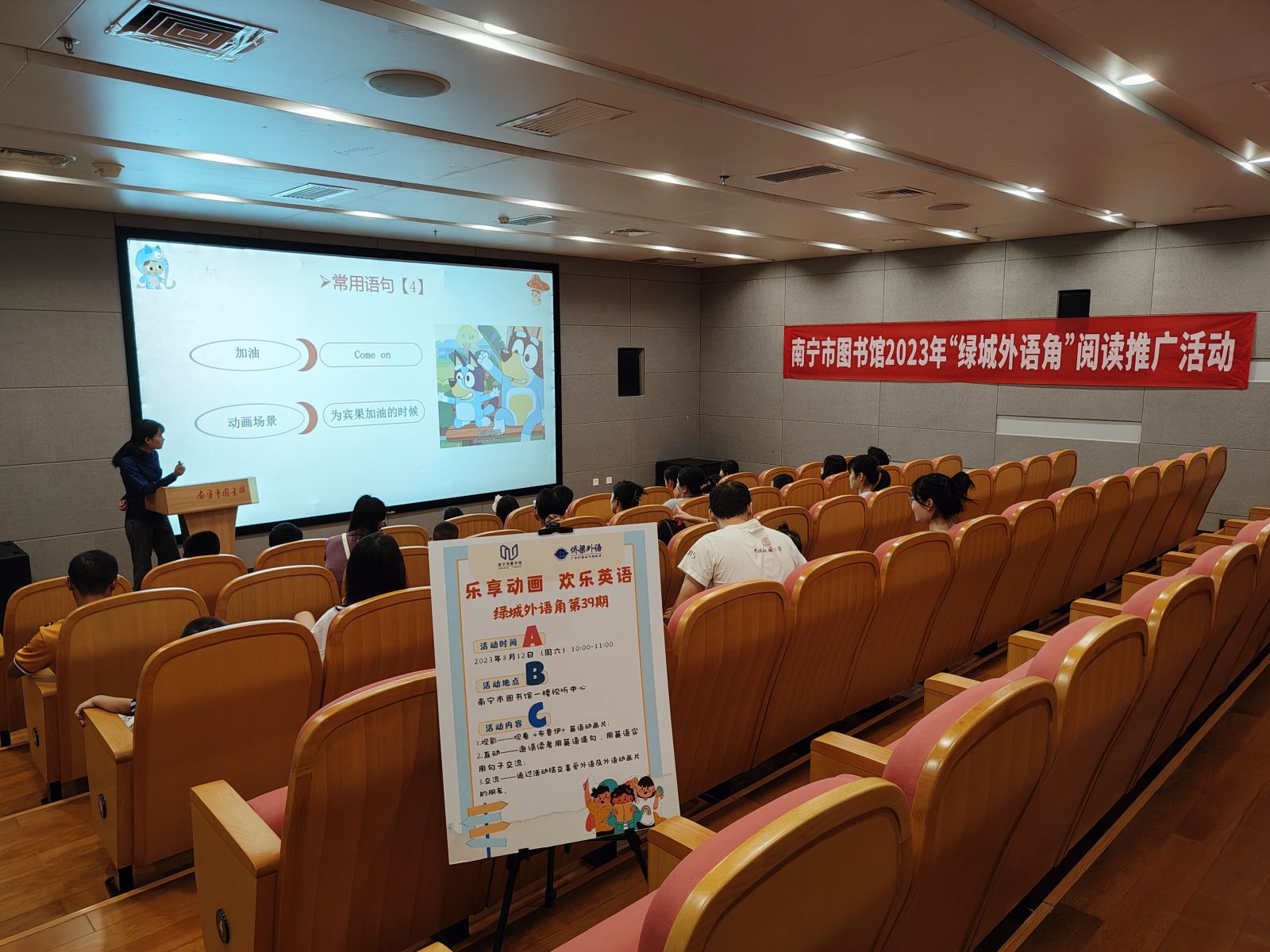 2023年8月12日上午,南宁市图书馆在馆内成功举办以“乐享动画 欢乐英语”为主题的第39期“绿城外语角”活动。“绿城外语角”是南宁市图书馆精心打造的文化活动品牌。活动采取线上线下相结合方式,开展包括英语、法语、日语、俄语、德语、西班牙语等多语言的不同外语交流、文化鉴赏、互动问答等内容的外语角活动,满足外语爱好者学习应用外语的需求。