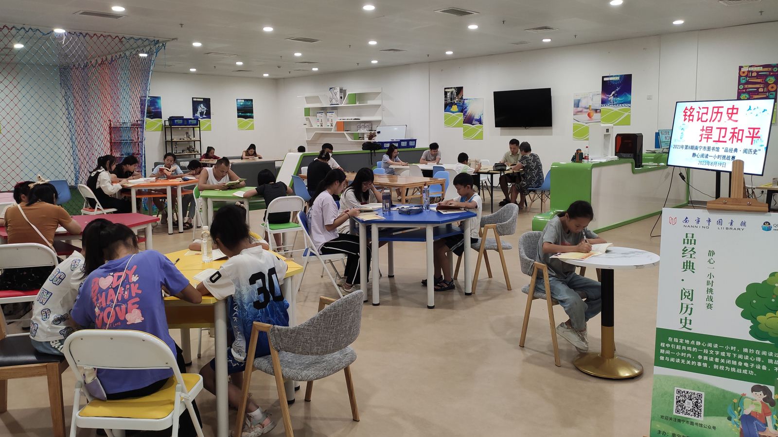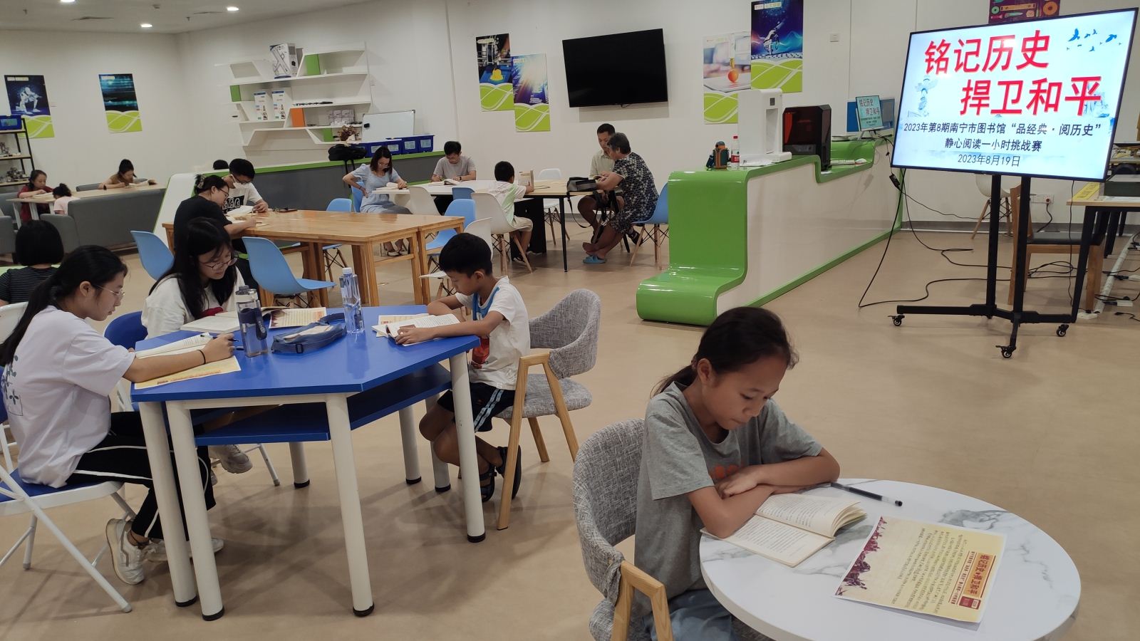 1945年8月15日,日本宣布无条件投降。这场胜利背后,是中华儿女顽强不屈地浴血奋战。为纪念这场来之不易的胜利,铭记这段血泪写就的峥嵘岁月,南宁市图书馆借阅部于2023年8月19日在本馆创客空间举办“品经典·阅历史——铭记历史,捍卫和平”静心阅读一小时挑战赛。