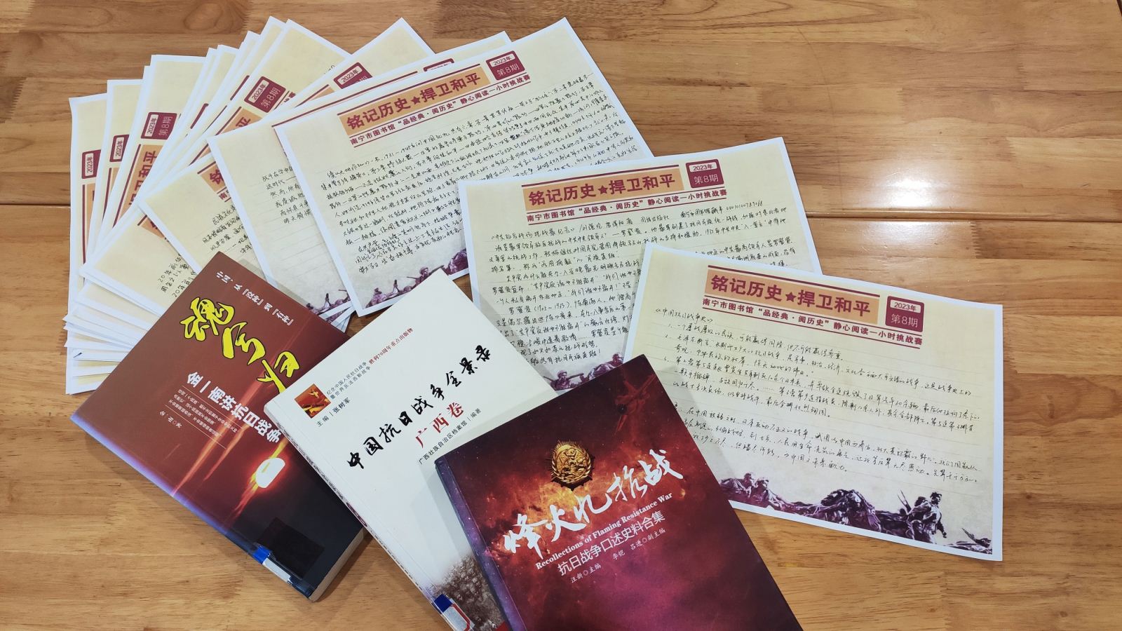 和平来之不易,吾辈铭记历史、珍爱和平、砥砺前行,这是对未来的最好担当。南宁市图书馆将继续结合社会主义核心价值观教育,推广“品经典·阅历史”静心阅读一小时挑战赛,让广大读者在书香中汲取精神力量。