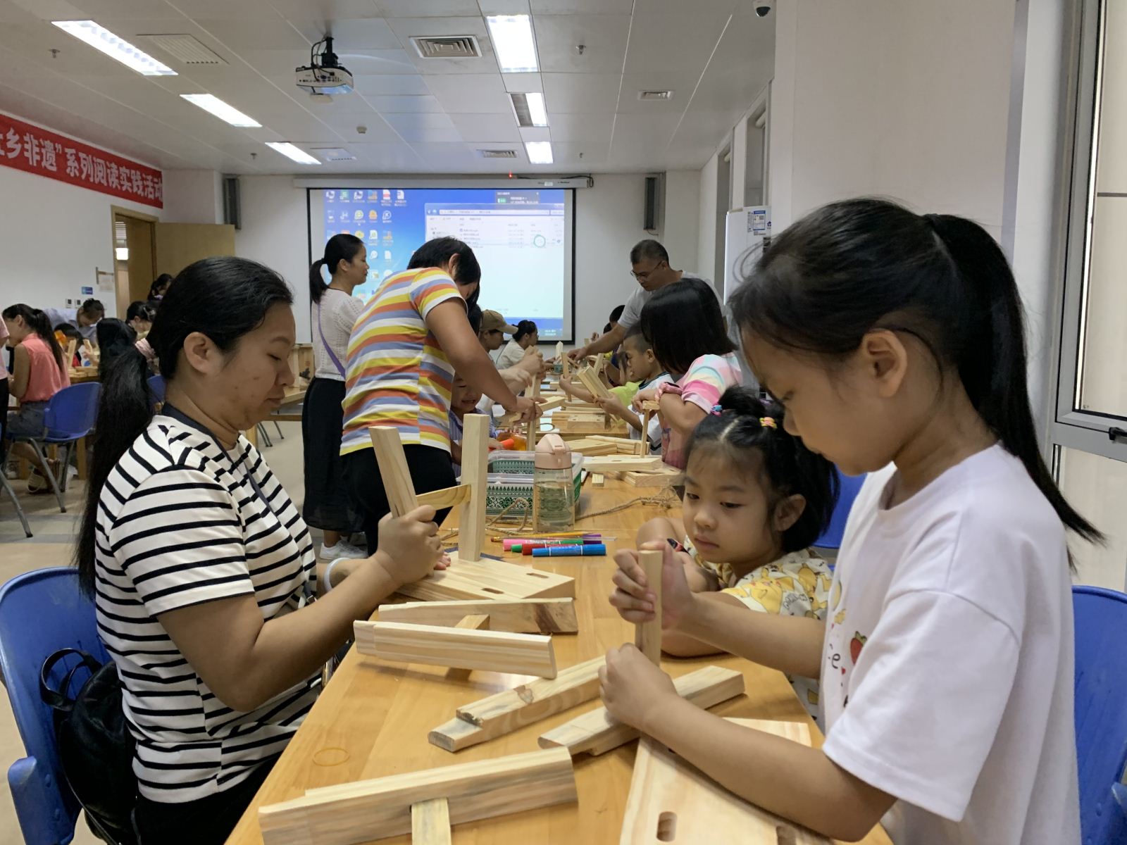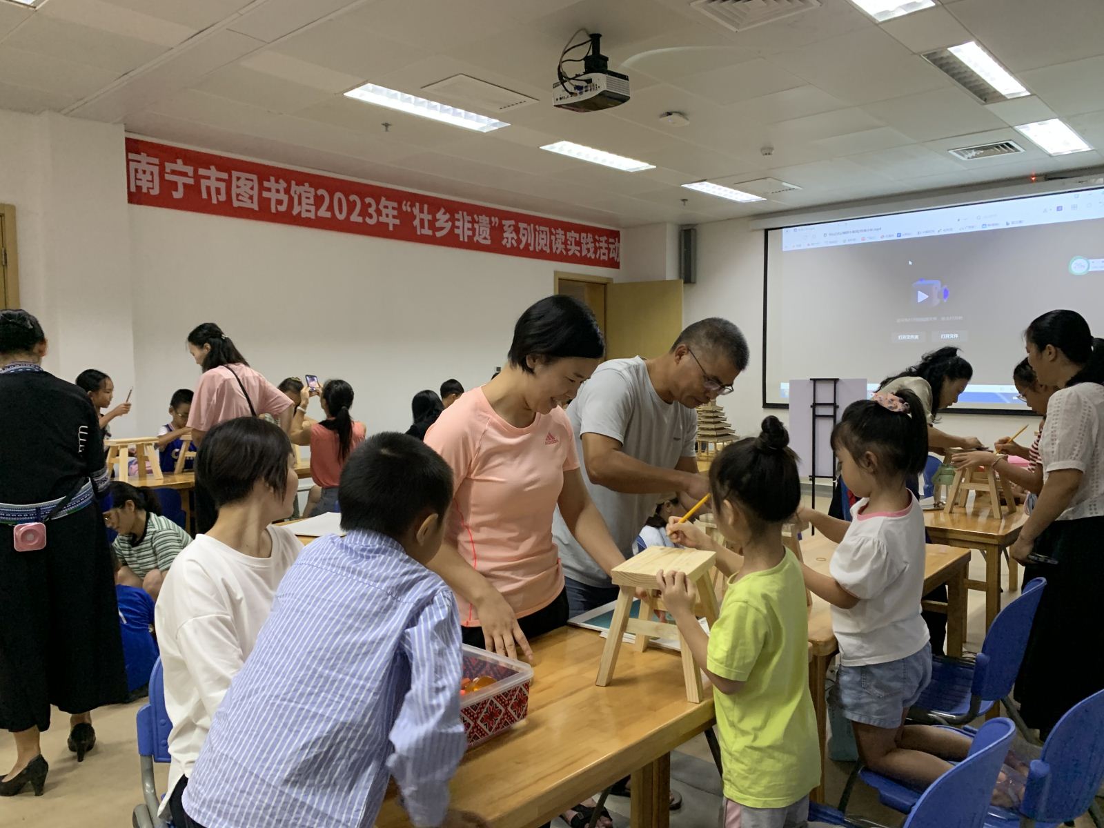 2023年8月26日上午,由南宁市图书馆主办的“壮乡非遗”系列第四期广西木构建筑之“榫卯小板凳”手工体验活动在市图书馆一楼活动室圆满举办。中国传统木结构建筑营造技艺自2009年入选联合国教科文组织人类非物质文化遗产代表作名录。为弘扬和宣传壮乡文化,本期活动以榫卯小板凳拼装为切入口,讲述中国传统木结构建筑营造技艺中榫卯结构基础原理与日常生活生产的关联性,以及广西木构建筑历史文化和传承故事,并通过打磨、拼装以及绘画等手工体验,让读者沉浸式体会到中国传统木构的艺术魅力。