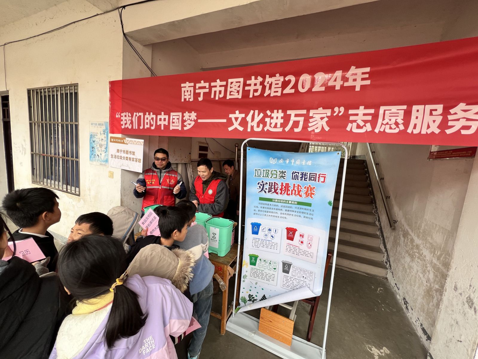 在横州市平马镇丁村村委小学,市图文化志愿服务队开展主题为“我们的中国梦——文化进万家”助力乡村振兴志愿服务活动,为丁村村小的师生们带去多种互动活动,如“童阅种子”绘本故事会——《龙的故乡》,垃圾分类实践挑战赛等。此外,志愿服务队还为师生们准备了品种多样的生活用品和精美的文具大礼包,让师生们通过游戏互动赢取礼品,以此送上南宁市图书馆最诚挚的节日祝福。