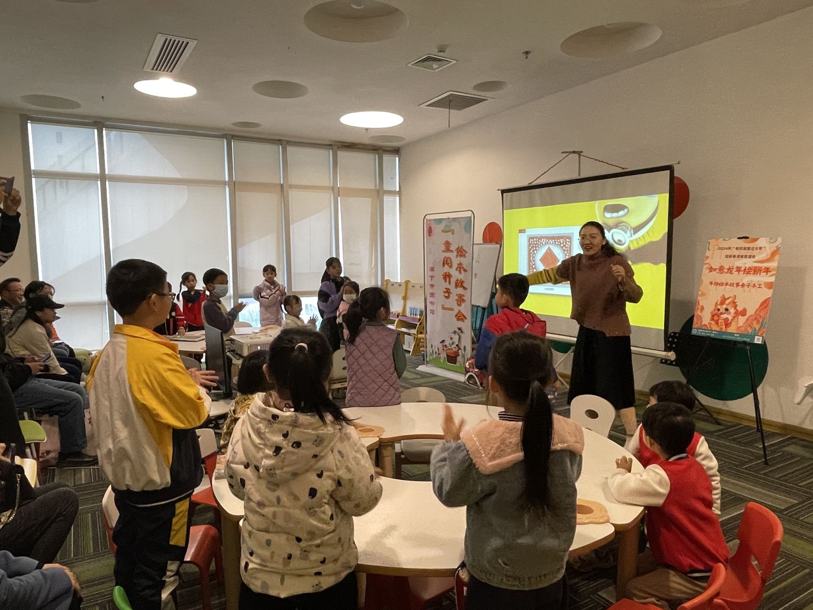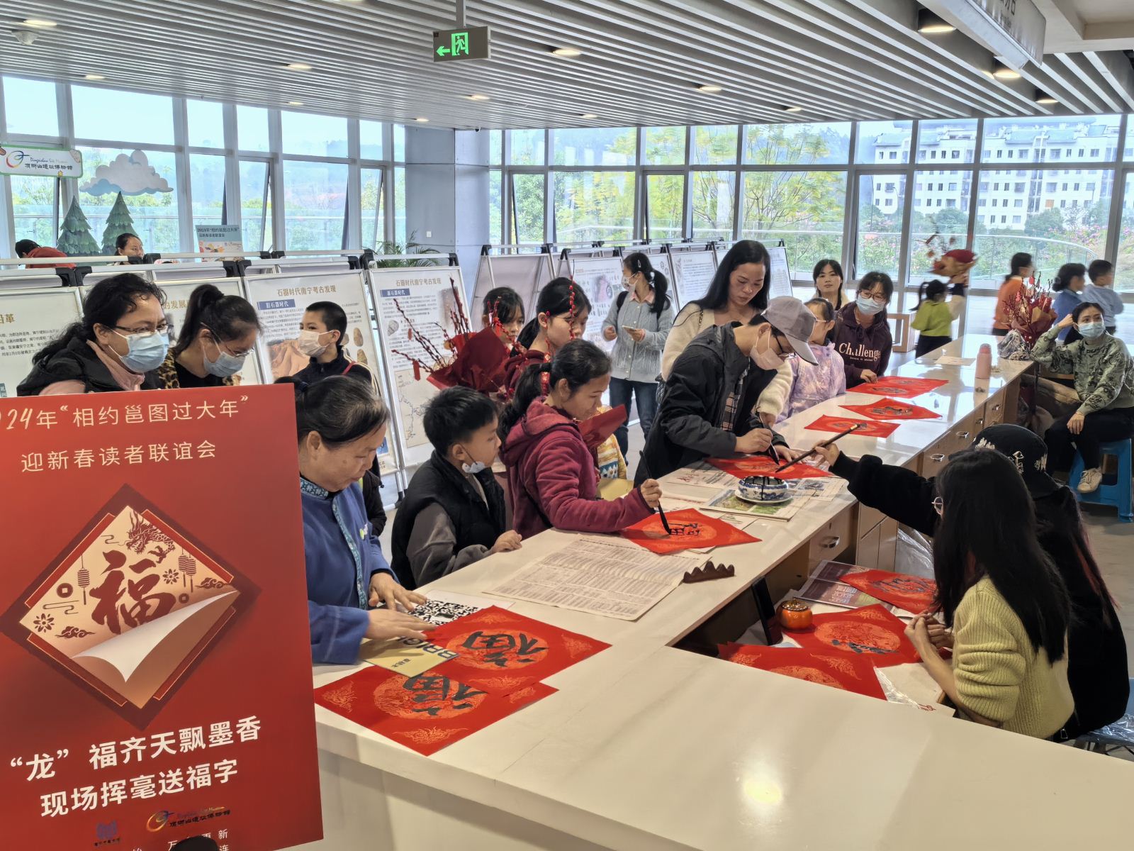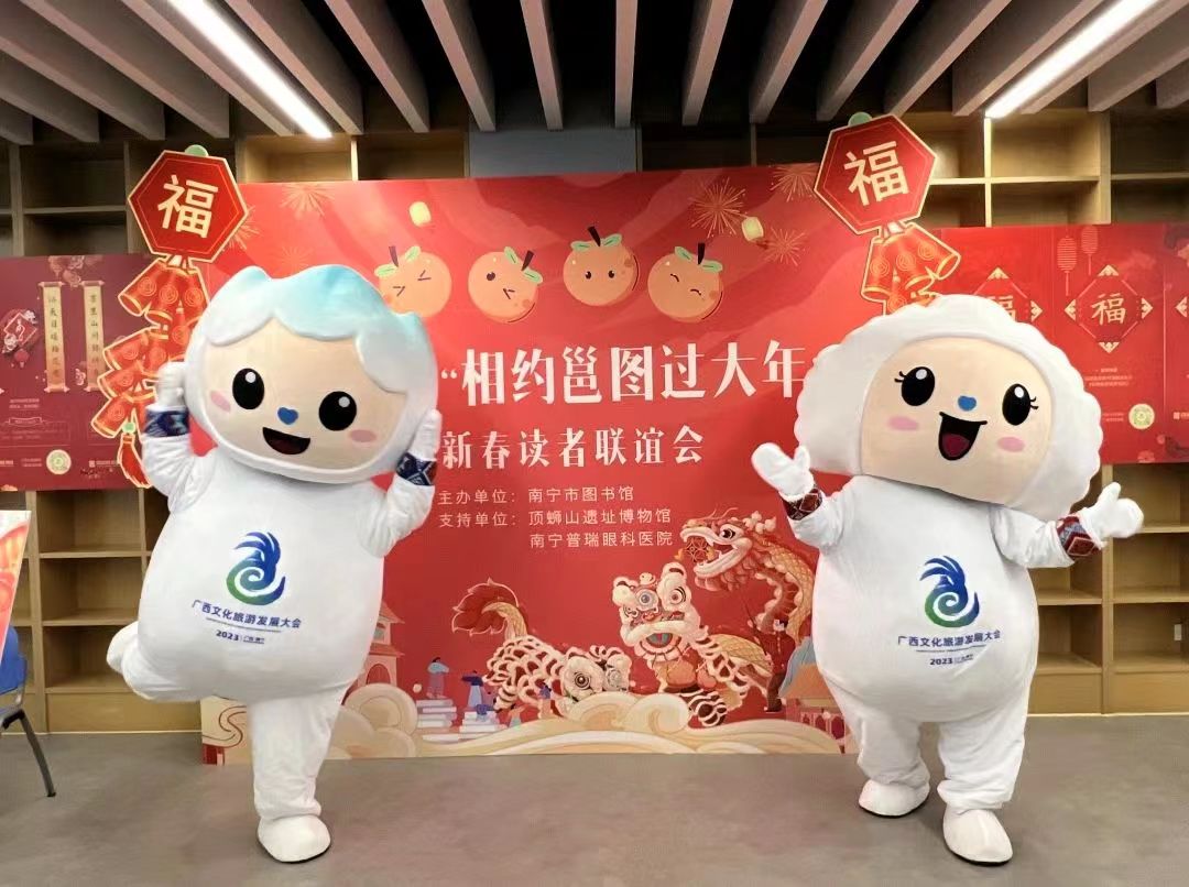 为使今年的“相约邕图过大年”活动能吸引更多不同年龄层读者参与,活动内容更具交流与互动感。二楼少儿阅览室还针对未成年人读者策划开展了如意龙年绘新年——年俗绘本故事会。绘本讲师带来年俗绘本《年》的故事,为少儿读者讲述过年时贴对联、挂灯笼、放鞭炮等年俗的由来。亲子家庭共同体验手工制作如意翻翻龙,营造欢乐祥和的新年氛围,感受中国优秀传统文化的魅力。而其乐“龙龙”猜灯谜、护眼健康知识宣讲活动则更为老龄读者欢迎。除此以外,“龙”福齐天飘墨香——现场挥毫送福字、“龙”重登场穿古今——顶蛳山遗址博物馆专展、2023年广西文化旅游发展大会吉祥物丘丘和贝贝在活动现场的可爱亮相更加展现了今年“相约邕图过大年”读者联谊会的文化气息。