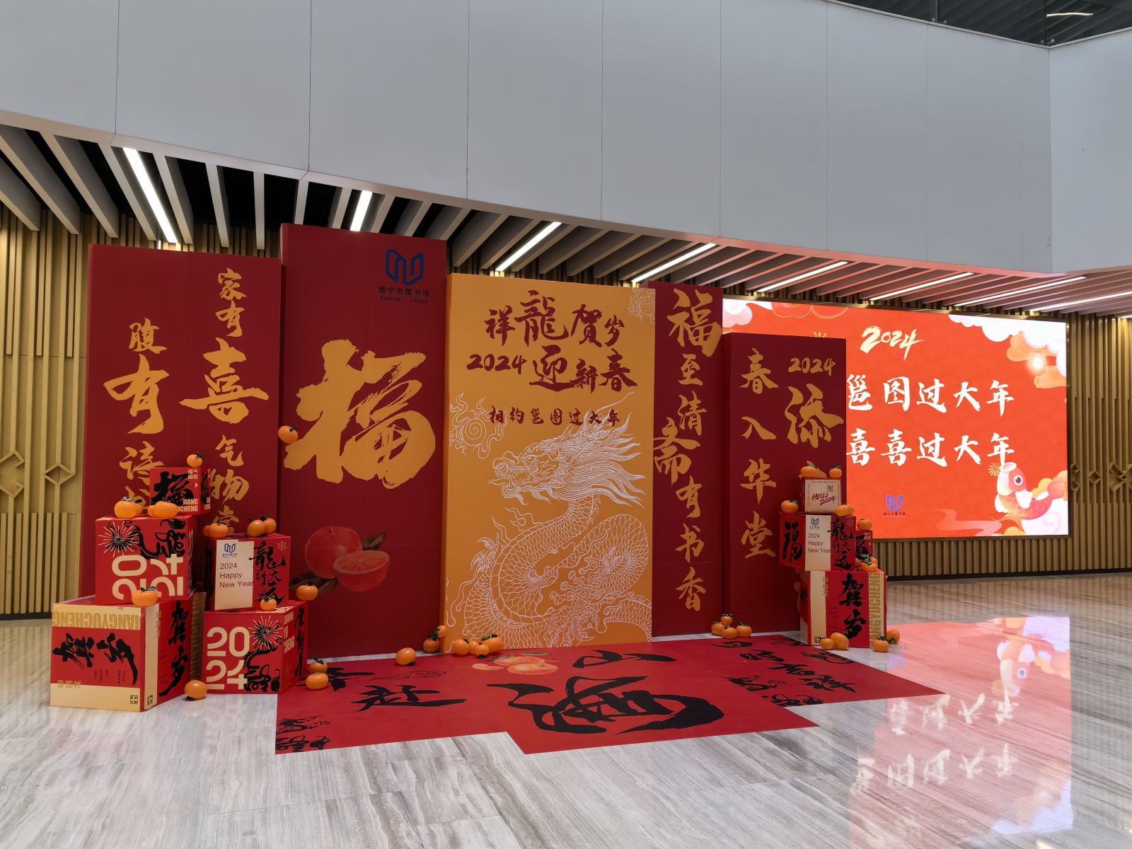 为用优质文化供给丰富人民群众的生活,满足人民群众喜庆过新年的美好需求,南宁市图书馆不仅在春节期间照常为读者开放,更针对不同群体的读者,因地制宜推出一系列喜庆多彩的迎新春读者活动。如:“经典续文脉·翰墨凝芸香”传统文化专题展览、2024年南宁市迎春剪纸作品展、“龙腾书海 春满文苑”春节主题线上讲座、祥龙贺岁迎新春——新年主题场景打卡赠年历、“童阅森林·书香龙年贺新春”童书专架、“我们的节日·元宵”传统文化主题活动、“龙行龘龘,前程朤朤”汉字叠韵争锋赛等27项线上线下活动,让读者在新春佳节能够通过体验丰富的文化活动体验欢乐祥和的新年氛围。