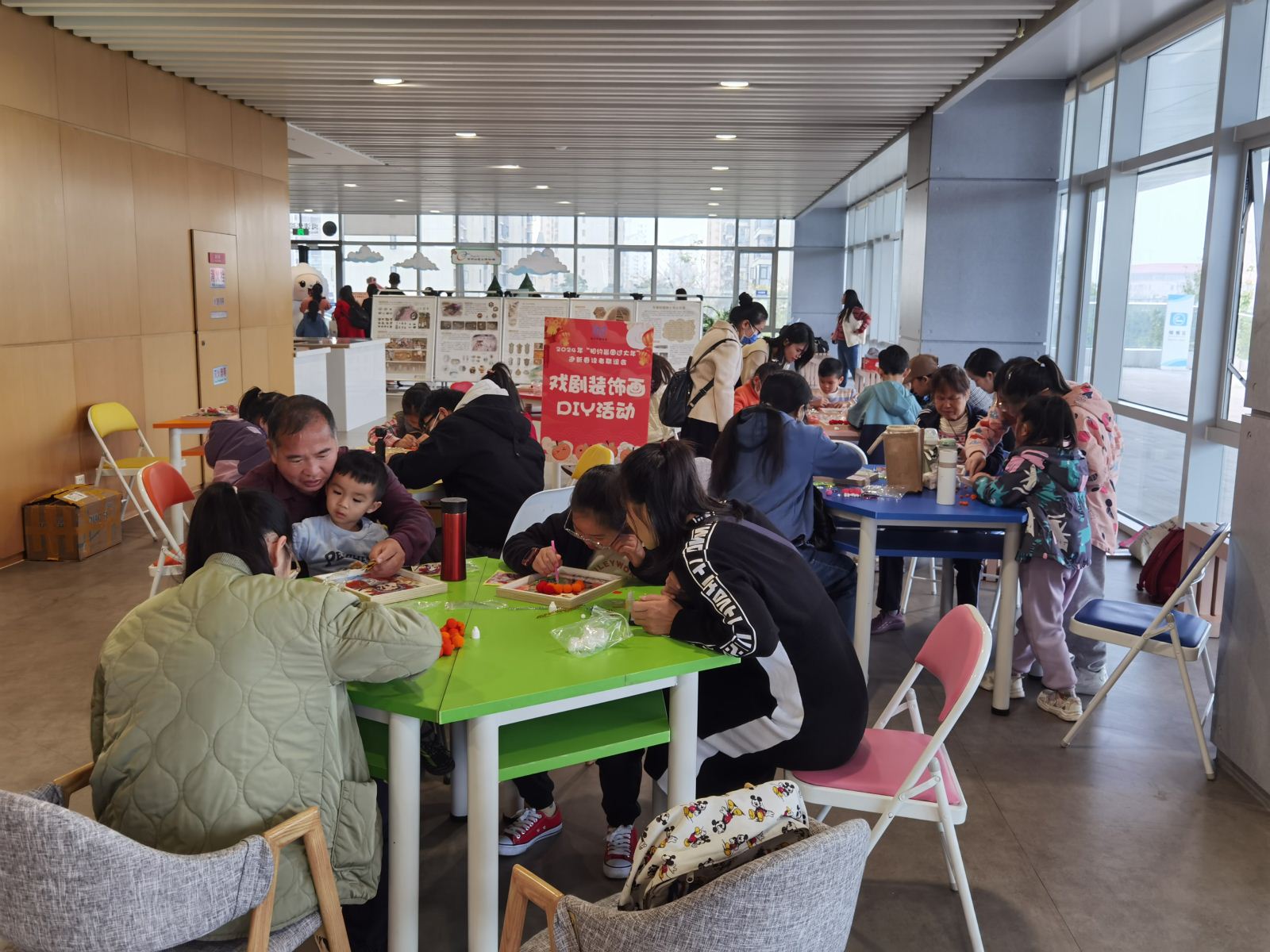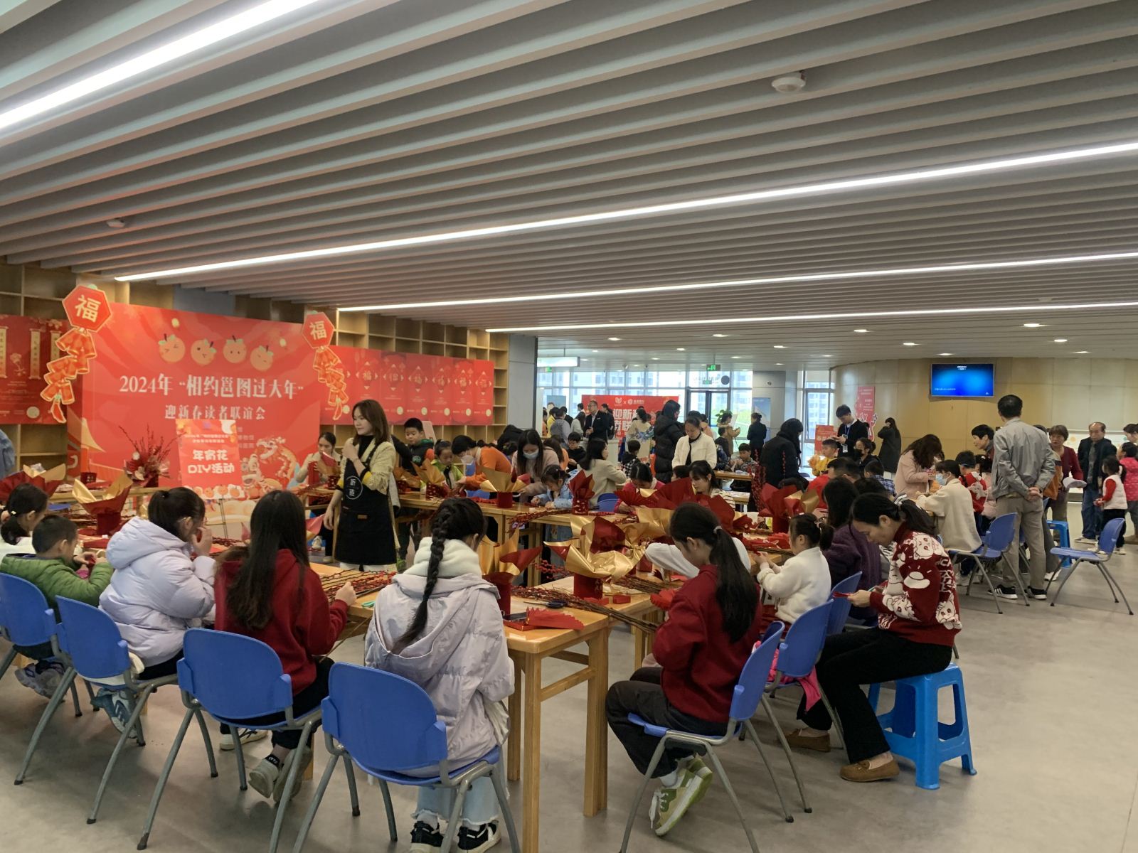 在亲子手工体验区域,独占鳌头迎新年——鳌鱼灯手工制作活动邀请非物质文化遗产鳌鱼灯手工制作师,带领市民读者共同制作鳌鱼花灯喜迎新年。鳌鱼灯是龙首鱼身,是“浮天载地”的象征,“独占鳌头”也是对读书人能成为栋梁的美好祝福。亲子家庭通过制作鳌鱼花灯作品表达新年祝福,营造和谐美好的节日氛围。雍“龙”华贵展国粹——戏剧装饰画制作活动,通过传统戏曲文化与现代美学的有机结合,组织市民读者制作戏剧装饰画。一方面弘扬和传承戏曲文化,一方面宣传戏剧脸谱知识,读者们设计出的戏曲形象展现出新鲜的生命力和时代感,为迎新春增添浓厚文化氛围。欣欣向“龙”扑鼻香——元宵花制作活动,专业花艺师讲解元宵花插花的基本技巧,从装饰品的选择、颜色的搭配以及元宵花由来及美好寓意等方面普及插花常识与基本技巧。随着市民读者现场体验,一盘盘火红喜庆的元宵花绽放在热闹的活动现场。