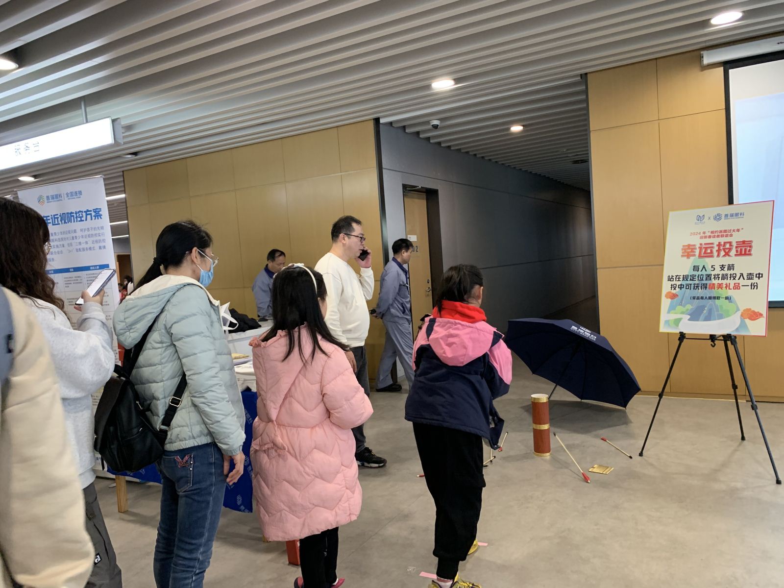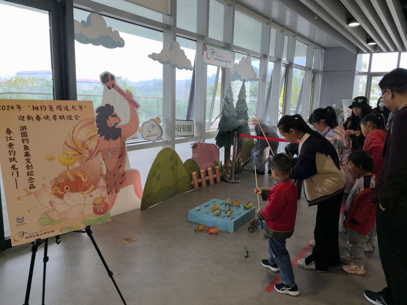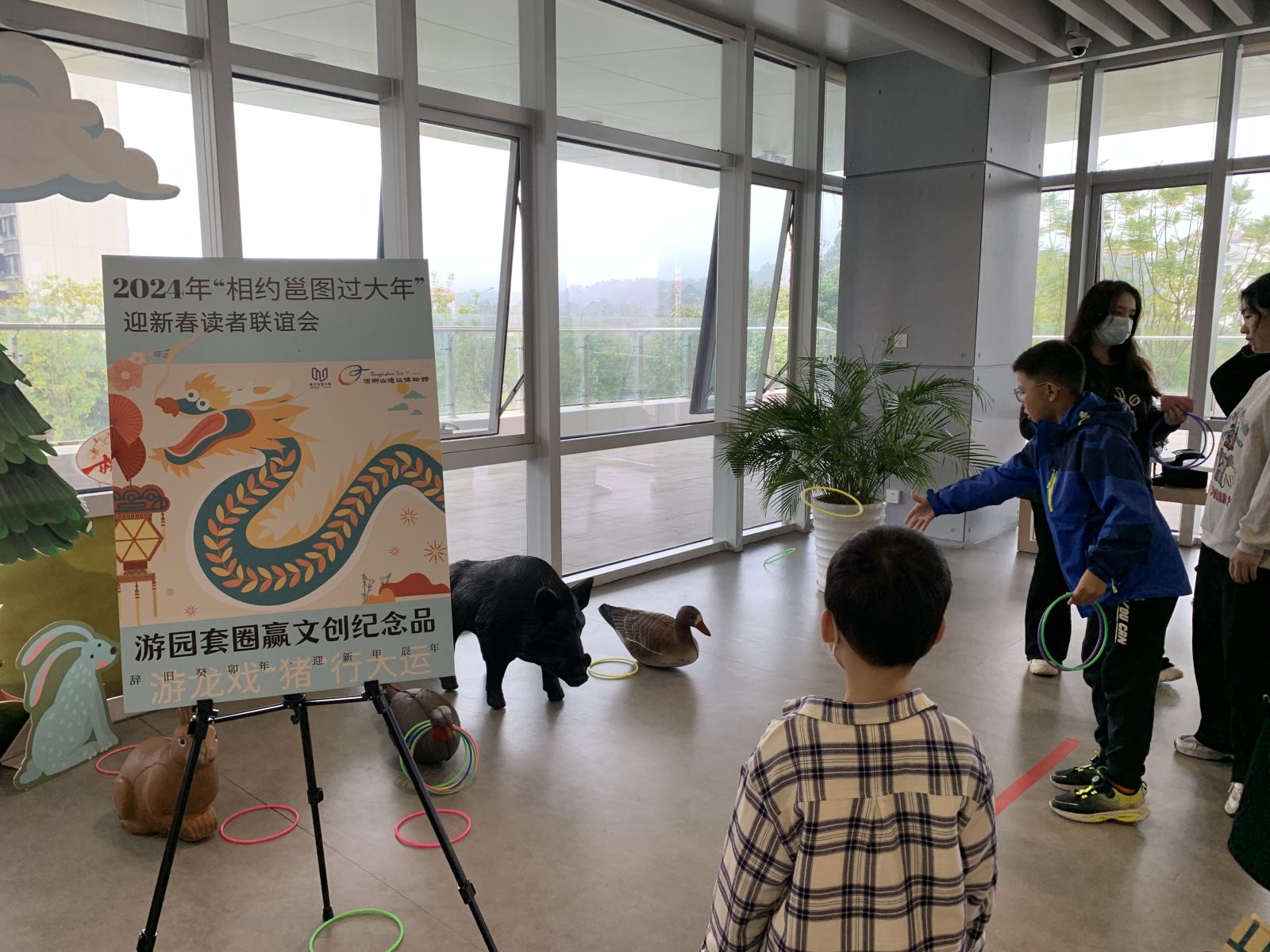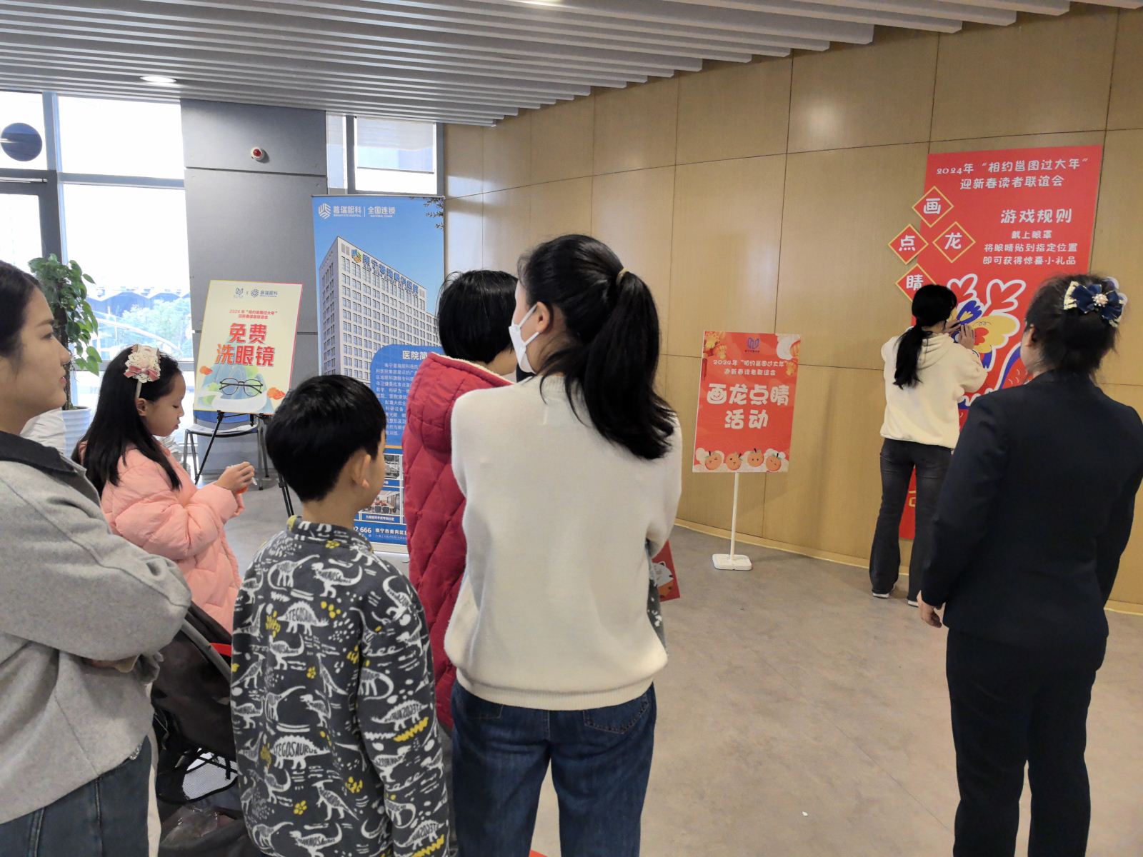 读者联谊会的游园互动项目更是氛围热烈,每一项活动都排起了长长的队伍,游戏间欢声笑语不断。画龙点睛赢好礼——万事大“橘”亲子互动游戏,参与读者需蒙眼为年画中的中国龙贴上眼睛来赢取砂糖橘挂件,寓意新年“大吉”。由活动支持单位顶蛳山遗址博物馆,根据万年前顶蛳山人通过狩猎、垂钓获取食物的方式推出的游龙戏“猪”行大运——游园套圈、春江垂钓跃龙门——游园钓鱼赢文创纪念品活动也同样吸引了许多家长和小朋友参与其中;普瑞眼科医院带来的一壶千金乐龙年——游园投壶赢新年礼物活动,让大家体验了别样的欢喜年味。