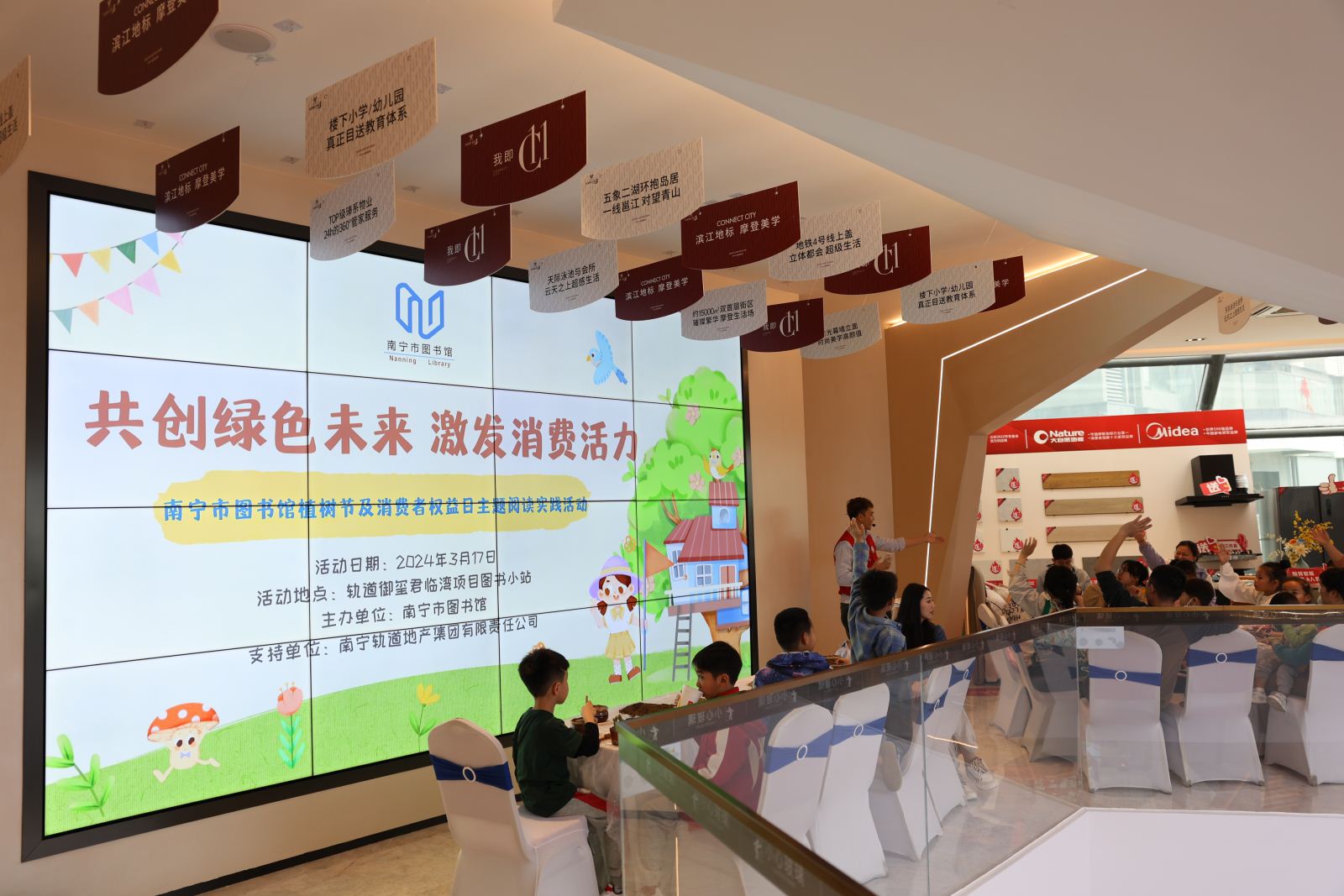 3月17日,南宁市图书馆面向市民读者,在轨道御玺君临湾项目图书小站(浮岛书吧)策划举办了“绿城学堂·共创绿色未来 激发消费活力”植树节及消费者权益日主题阅读活动。