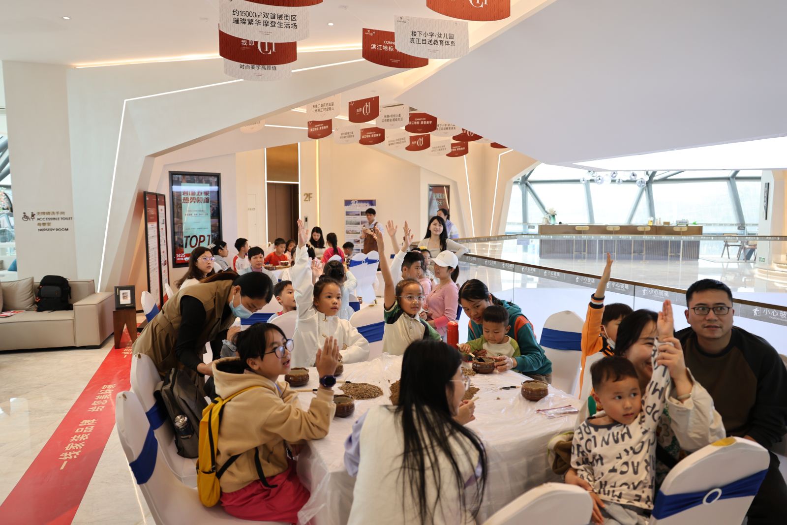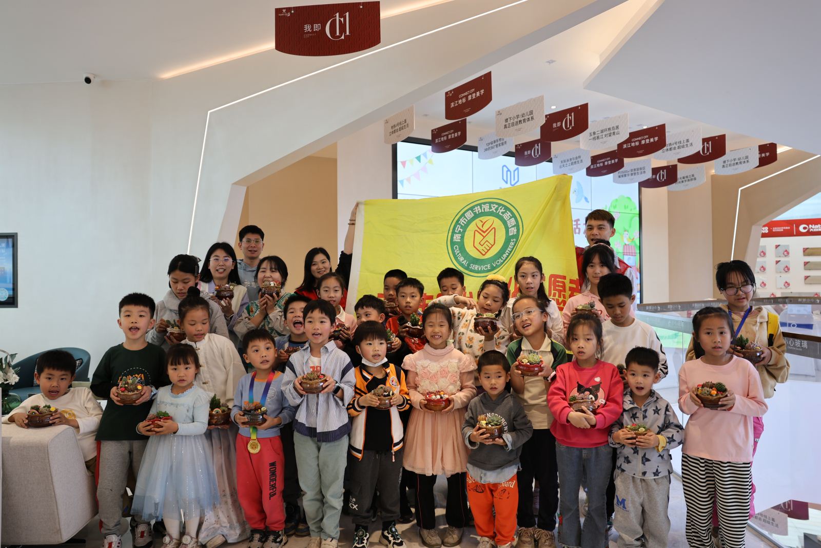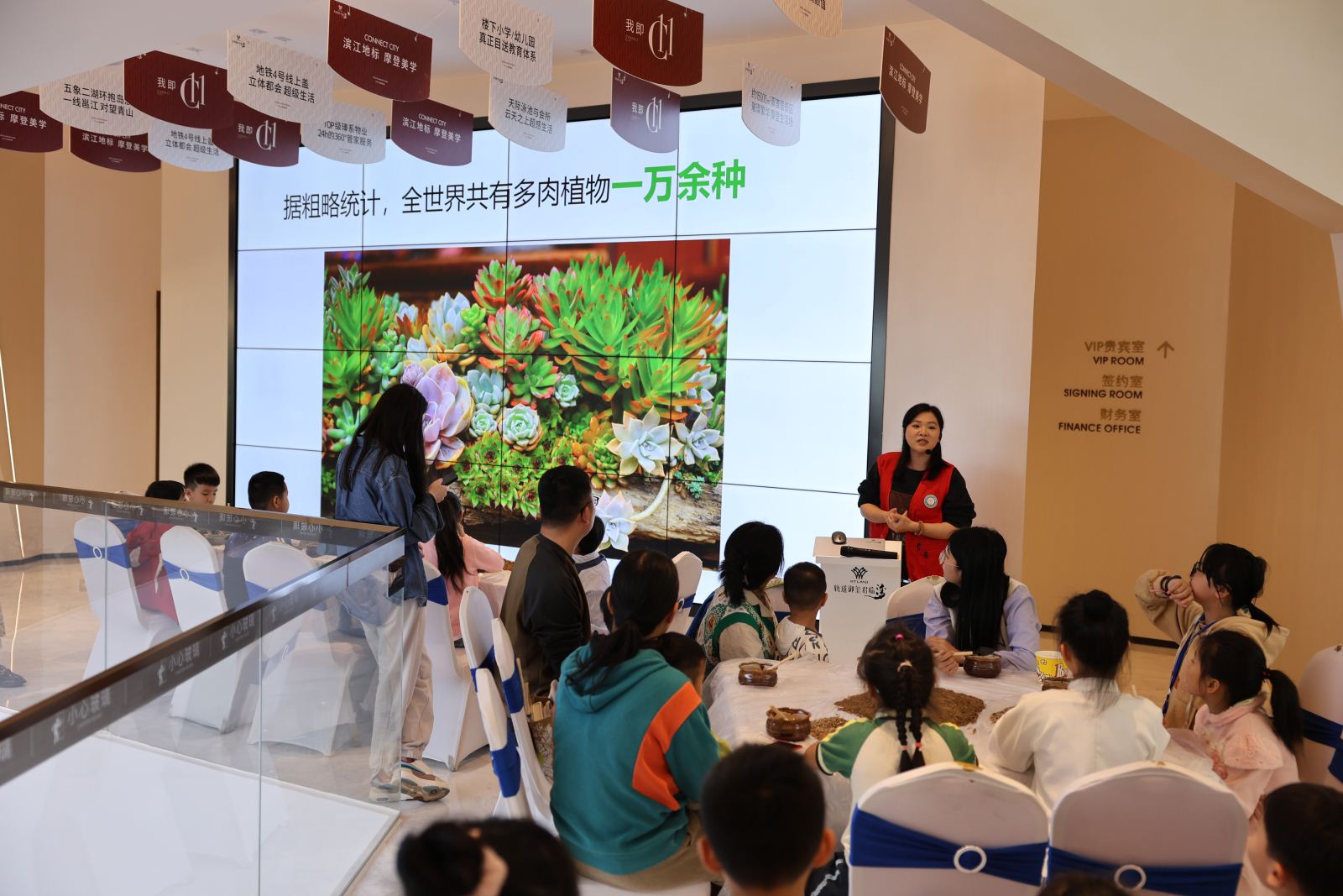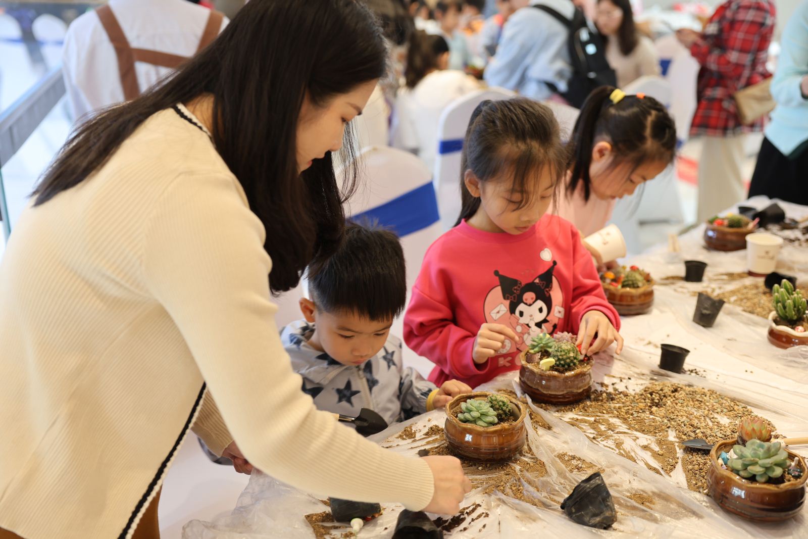 接着,亲子家庭参与到“手植绿意·多肉盆栽DIY”手工制作中。手工老师结合绿植种植及养护知识,现场指导小读者们载种、装扮多肉盆栽。小读者们按照老师的提示先将准备好的土壤按比例盛到盆器里,再小心翼翼地把分发下来的植物摘种进去,最后插上彩虹、蘑菇等小摆件作为装饰,一个个精致可爱的多肉盆栽就完成了。