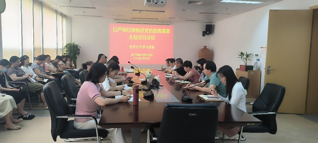 习近平总书记强调:“组织开展好党纪学习教育,引导党员干部学纪、知纪、明纪、守纪,督促领导干部树立正确权力观,公正用权、依法用权、为民用权、廉洁用权。”为深入学习贯彻修订后的《中国共产党纪律处分条例》,4月26日上午,南宁市图书馆党支部组织开展“以严明纪律推进党的自我革命”主题党日活动,活动采取观看视频和分享学习感受相结合的形式进行,30名党员干部参加了本次活动。