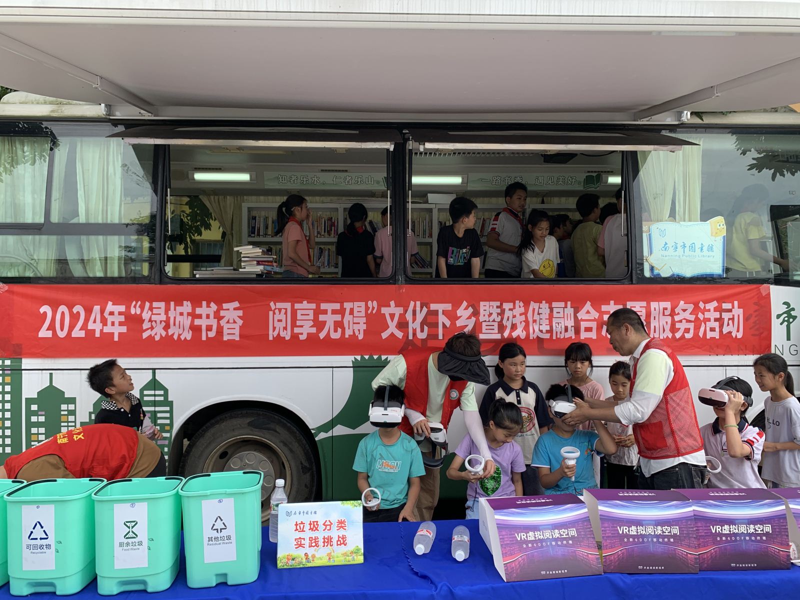 在良庆区六里路小学和宾阳县新桥镇民范学校,同学们在老师和志愿者的组织下,分批有序排队到走读巴士上挑选图书,下车后到走廊、树荫下、楼梯等阅读场所开展自主阅读活动;在走读巴士旁开展的“绿城展廊·儿童图书大奖巡礼”展览不仅给整个活动现场营造书香氛围,还给予课外阅读的专业指导,让同学们在阅读的海洋中不再迷茫;参加垃圾分类科普实践赛的学生热情高涨,乐此不疲的不断加入到挑战中;VR阅读体验激发了同学们的浓厚兴趣,在志愿者的帮助下分批体验VR设备,身临其境感受各类知识场景和虚拟世界,以全新的视觉享受个性化的阅读体验。此外,市图书馆与南宁市残疾人事业服务协会在宾阳县新桥镇民范学校共同开展“绿城书香 阅享无碍”文化下乡暨残健融合志愿服务活动,为当地留守儿童捐赠学习生活物资一批。
