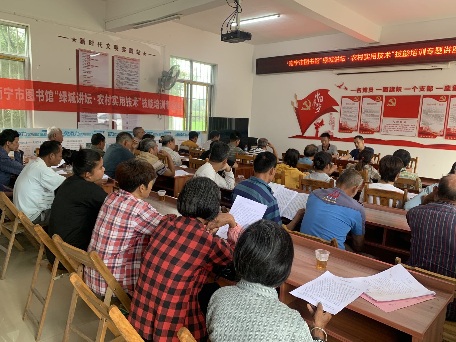在横州市平马镇丁村,市图书馆党员志愿先锋队9名同志深入乡村开展“党员先锋在行动 文化科卫三下乡”乡村振兴志愿服务活动,用知识助力乡村振兴。为当地村民邀请专家开展“绿城讲坛·农村实用技术(肉鸭养殖)”技能培训专题讲座;引导村民观看“绿城展廊·让免疫力成为最好的医生”健康知识科普展览;为村小师生开展走读巴士阅读推广、VR阅读体验、垃圾分类科普知识问答、禁毒知识有奖问答等活动;在黄艾村教学点开展“邕图喜阅会·绘本说故事”活动,讲述经典绘本《马背上的女图书馆员》;还为该教学点“乡村朗读者”图书驿站捐赠漂流图书200册,充分发掘乡村文化需求并主动嵌入到乡村教育和文化服务中去。