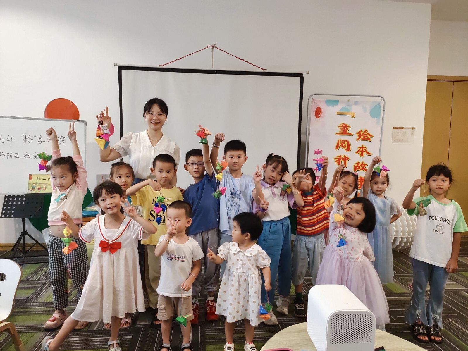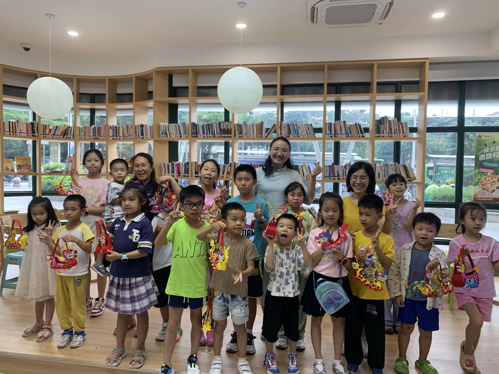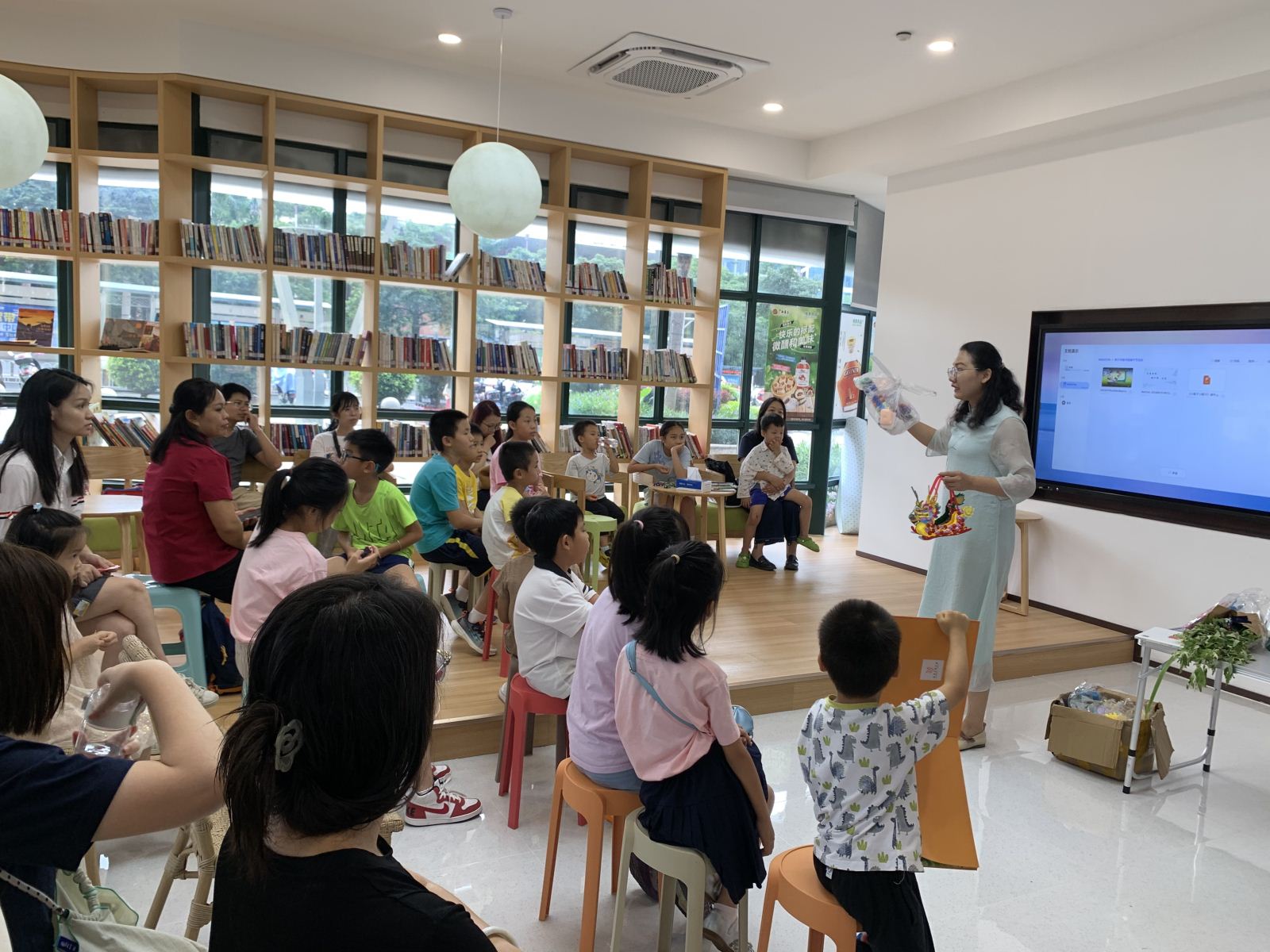 2024年6月10日端午节当天下午,南宁市图书馆2024年“我们的节日·端午”传统文化阅读推广活动在书香四溢的会展航洋城民生驿站图书分馆顺利开展。来自南宁市图书馆文化志愿服务队的老师先给儿童读者们播放端午节动画短片,讲述节日的由来,并以互动问答的方式引导小读者们举例谈谈自己了解到的端午习俗,如吃粽子、划龙舟、挂艾叶、喝雄黄酒等。接着,阅读推广人方苗苗老师分享了绘本故事《小粽子,小粽子》,通过讲述南北方粽子的甜咸“碰撞”来告诉小朋友们:不论是甜粽子还是咸粽子,都是中华的小粽子!同时也启发大家要了解南北方的饮食习惯,并尊重南北方的文化差异。最后,在老师和家长的陪伴下,孩子们亲手制作了国潮龙舟灯。除了按照既有的教程拼制,小读者们还联系实际、大胆想象,用艾叶装饰龙舟、用黏土捏出划手,制作成一艘艘匠心独运的龙舟灯。此次活动让读者们更深入地感受到中华文明的博大精深、更深刻地理解了中华优秀传统文化的内涵,活动开展期间引来不少市民驻足观看。