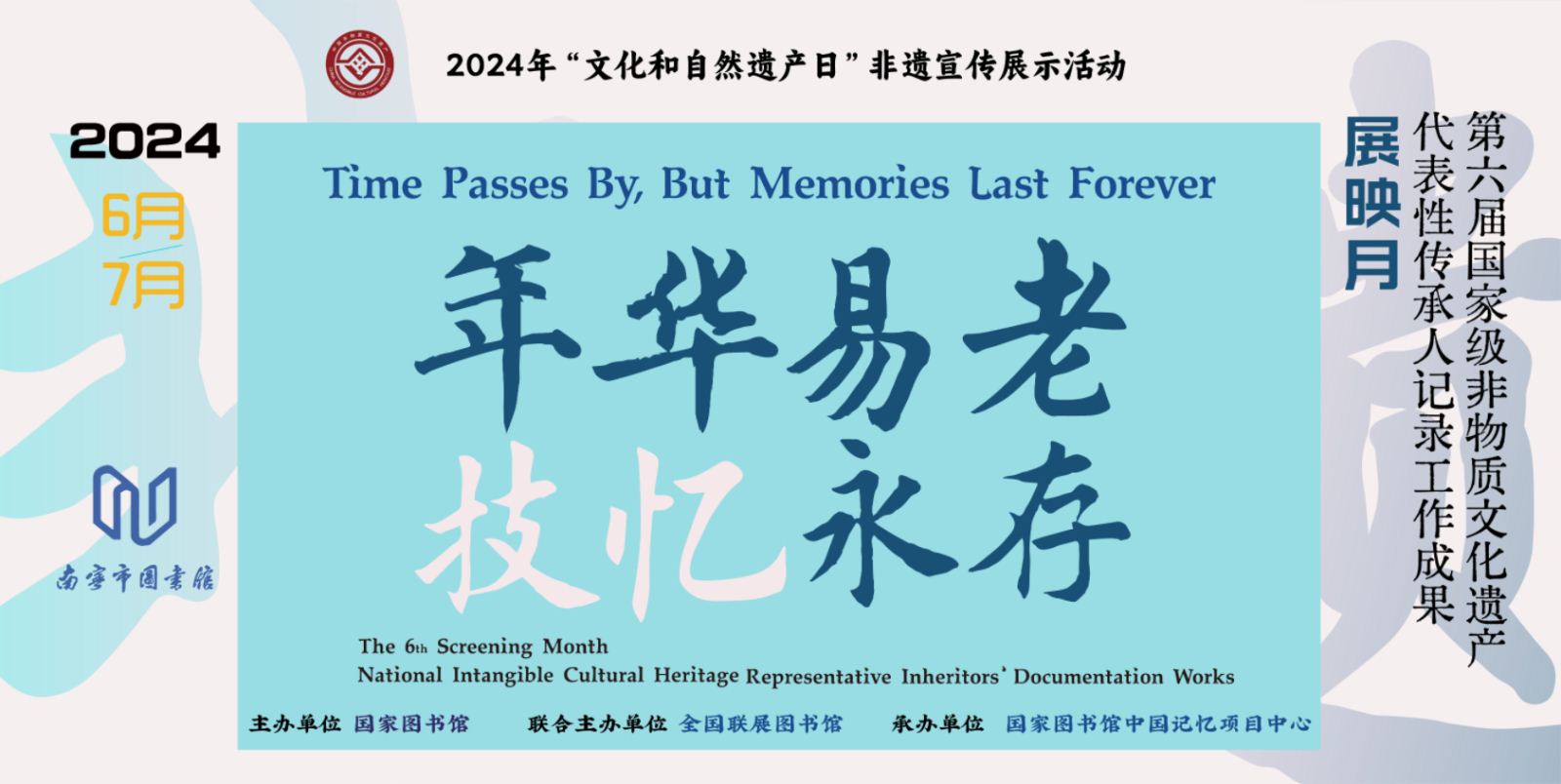 在我国第19个文化和自然遗产日到来之际,为了充分发挥国家公共文化服务体系的阵地作用,让读者能在文化和自然遗产日期间共同欣赏非遗的多彩魅力,南宁市图书馆参加由国家图书馆主办的 “年华易老,技·忆永存——第六届国家级非物质文化遗产代表性传承人记录成果展映月”活动。活动期间,在本馆微信公众号对获评优秀的传承人记录项目的综述片(以记录所得影音文献为基础制作的非遗纪录片)进行线上展映,配以相关图文,介绍传承人和非遗项目相关知识,对优秀成果进行推广,提高资源的能见度和可用性。从2024年6月17日至7月28日,在本馆三楼音乐图书馆,在优秀成果的综述片中选取展映作品,面向读者进行公益线下放映。此外,从2024年6月15日起,在本馆一楼城市客厅举办非物质文化遗产名录(册)项目传承人记录成果特展,介绍各类非遗项目优秀传承人及记录其工作的成果,提升公众对非遗保护工作的获得感和认同感,以保护传承非遗,赓续历史文脉,共同享有非遗保护的优秀成果,共同守护中华民族的精神家园。