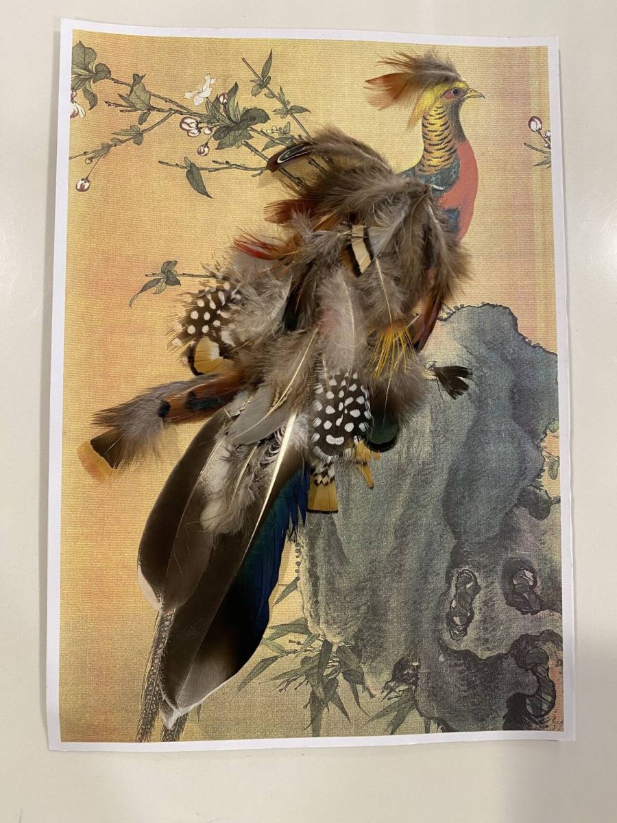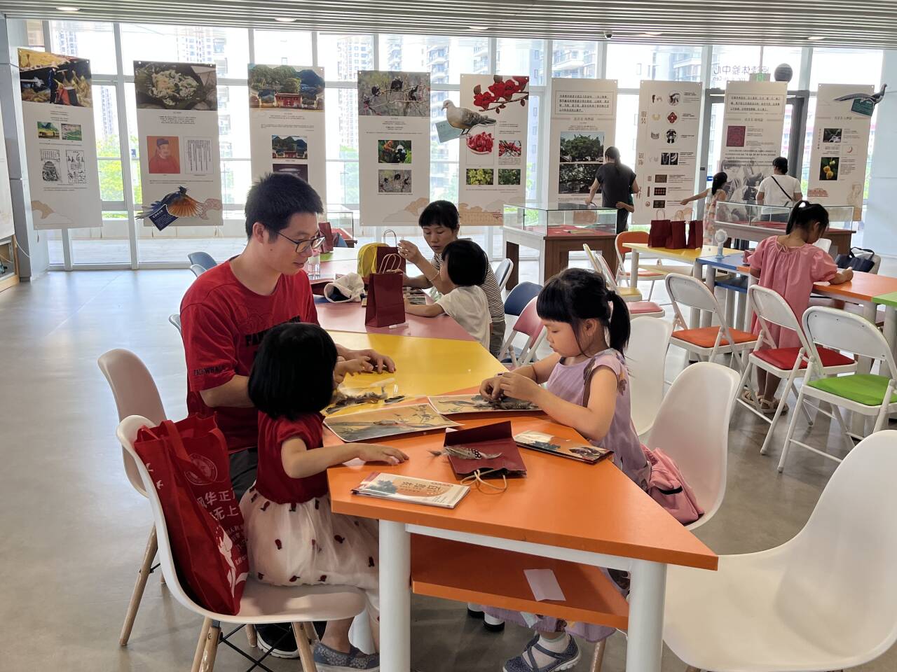 参加活动的读者们领到了羽毛材料包,凤凰底图和胶水,通过发挥想象在凤凰底图上贴羽毛,制作出自己心中那勇气果敢、气宇轩昂的凤凰。很多小朋友在家长的帮助下,顺利完成了自己的凤凰贴画。活动结束后,读者们纷纷拿着自己的作品在现场与展板合影。