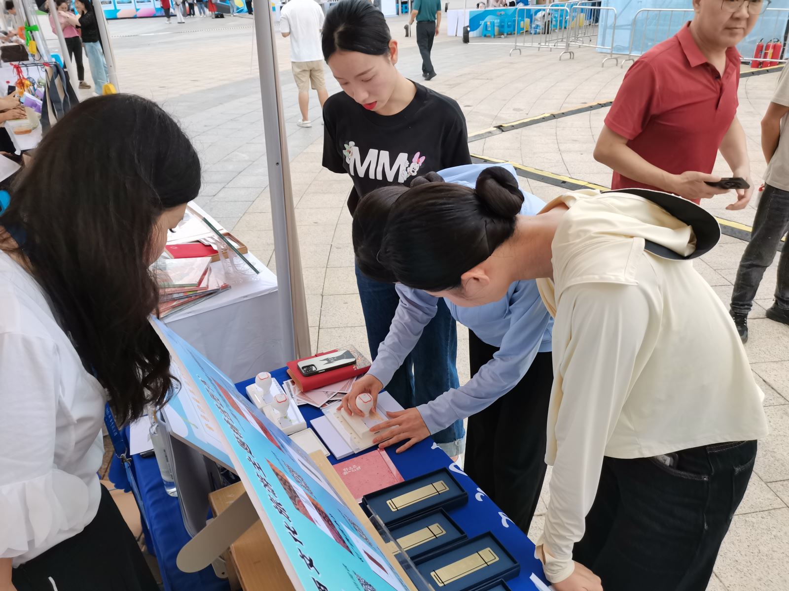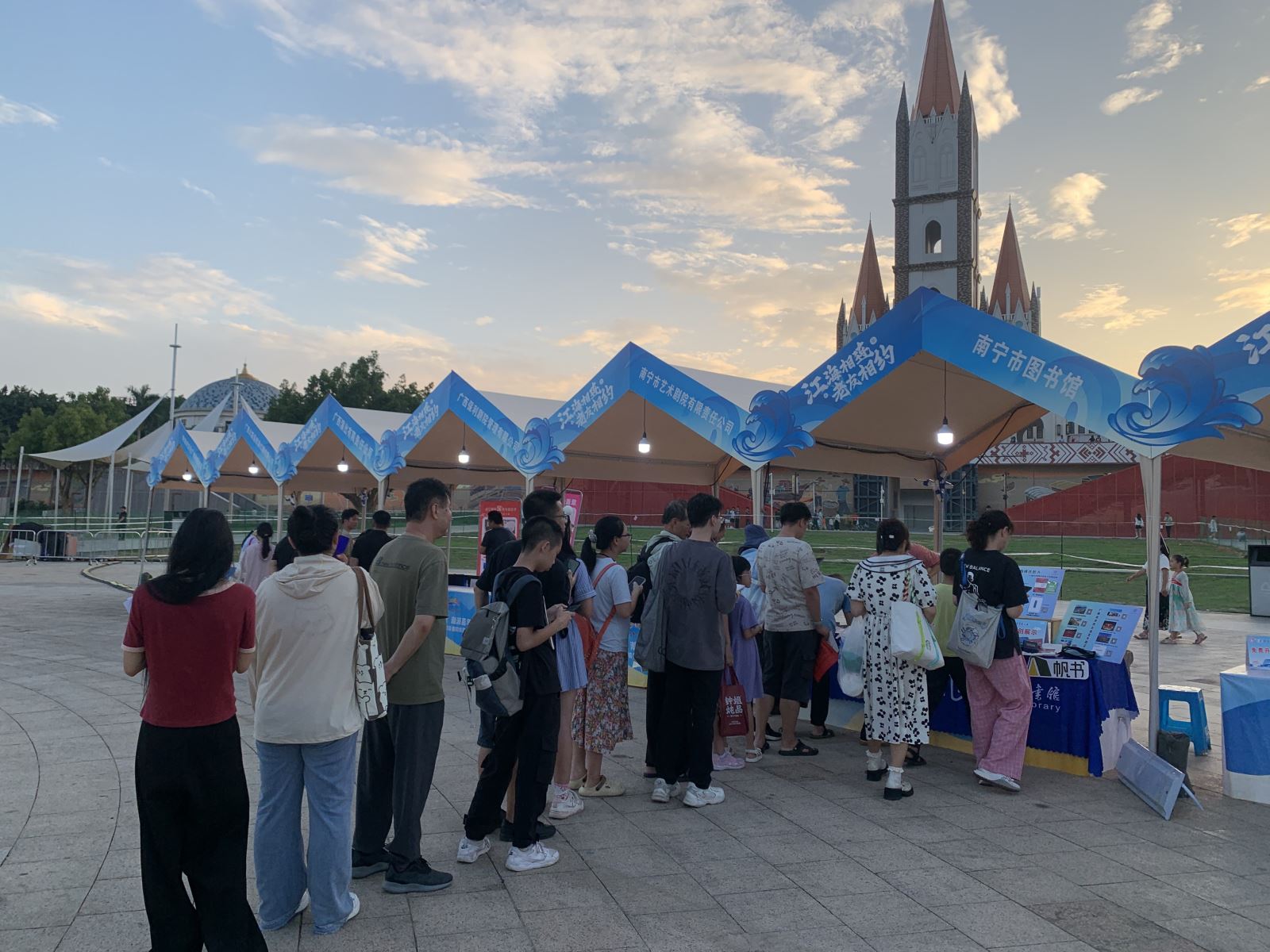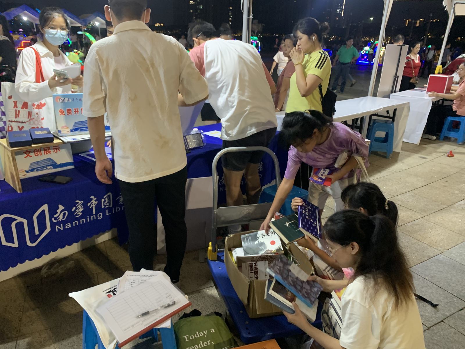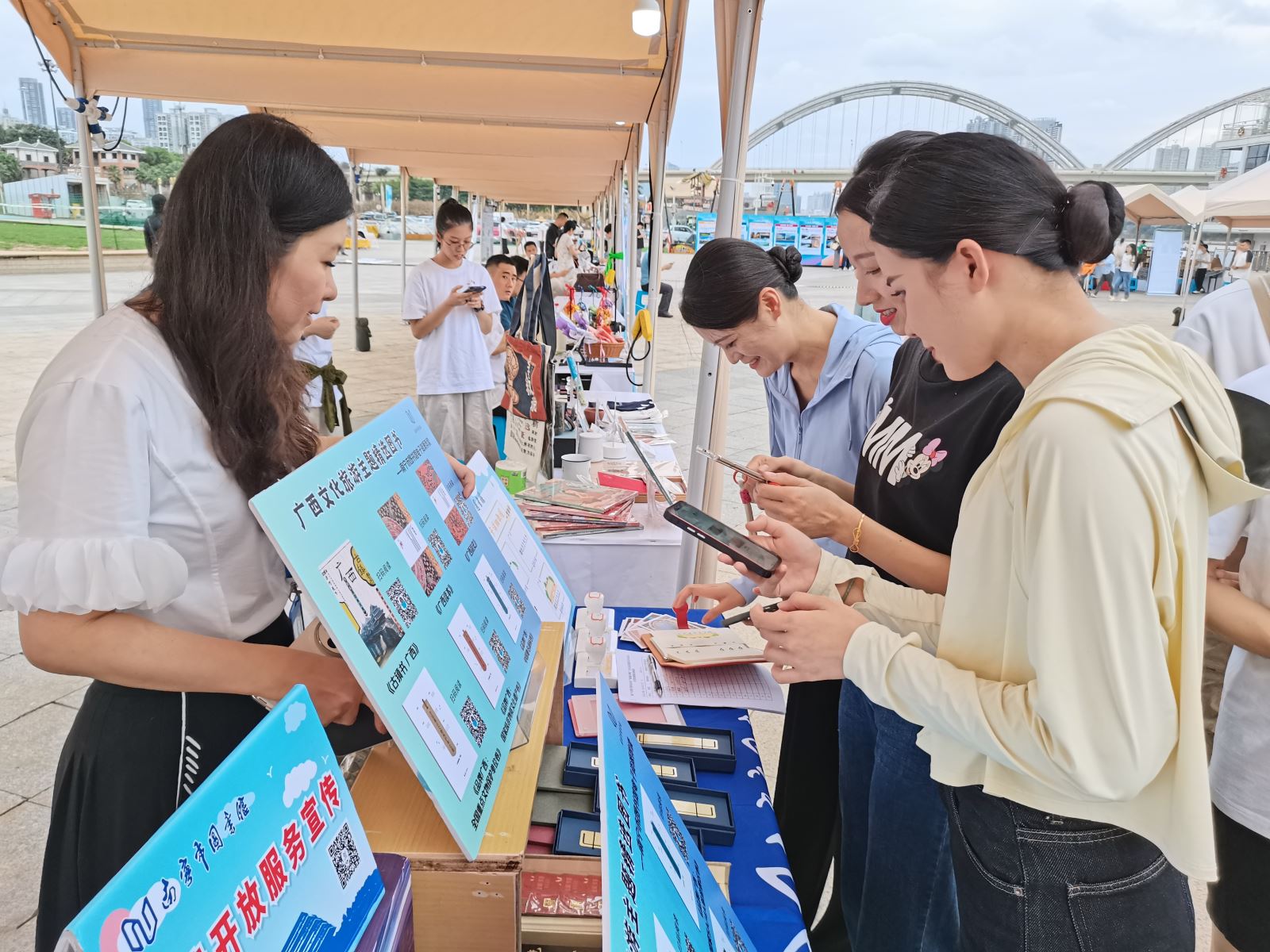 南宁市图书馆以极具特色的阅读服务宣传活动吸引了大批游客排队参与,其中又以文化展示活动最受欢迎。此次文化展示活动主要展示南宁市图书馆的文创产品,包括明信片、金属书签、笔记本、帆布袋、镇木纸等。文化展示活动现场开展明信片盖章打卡活动,现场放置南宁市图书馆特色印章,现场游客参与活动即可打卡盖章。同时,还在活动现场开展“知识交换站”图书捐赠交换活动,南宁市众多读者携带符合捐赠规则的图书到现场兑换换书劵,并使用换书劵兑换了自己喜欢的书籍。