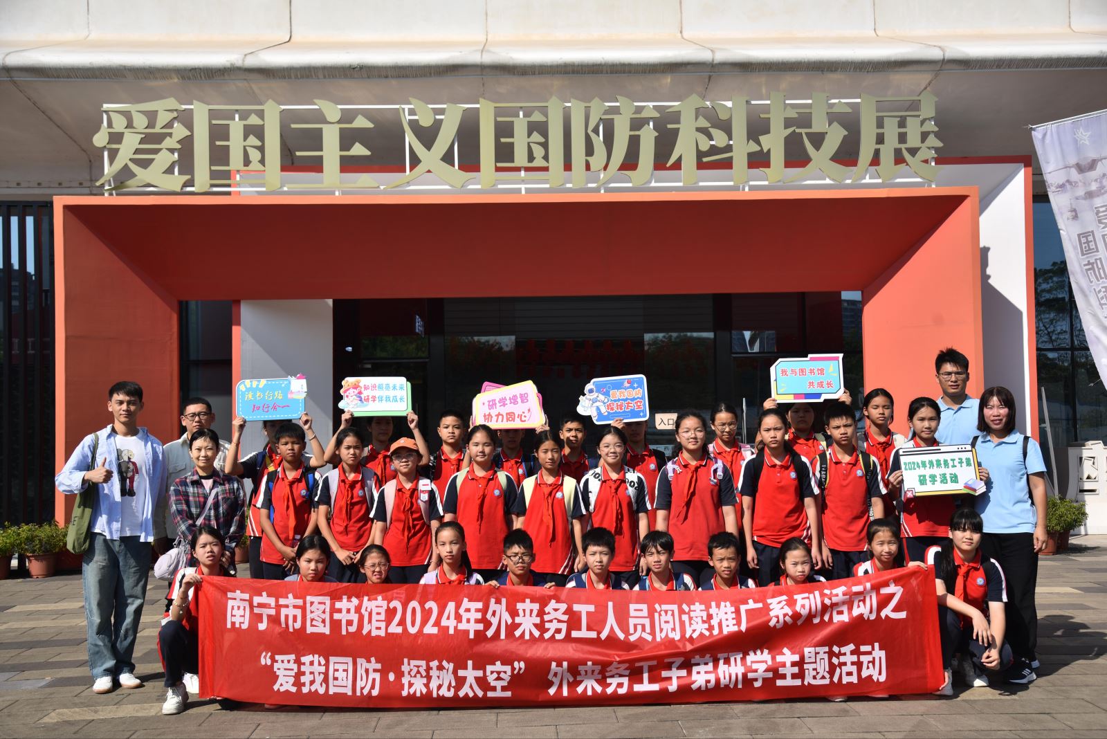 为了丰富南宁市外来务工人员精神文化生活,推动全民阅读活动广泛深入开展,11月20日,南宁市图书馆组织开展了2024年外来务工人员阅读推广主题系列活动之“爱我国防·探秘太空”外来务工子弟研学活动。此次活动是由南宁市文化广电和旅游局主办,南宁市图书馆承办的2024年南宁市外来务工人员文化艺术活动节中阅读推广主题活动的其中之一,研学活动以“航空航天”和“国防”为主题,将“知”与“行”合二为一,为孩子们开辟了“校外第二课堂”,注重实践性、趣味性,创新国防教育方式方法,强化国家安全观教育。