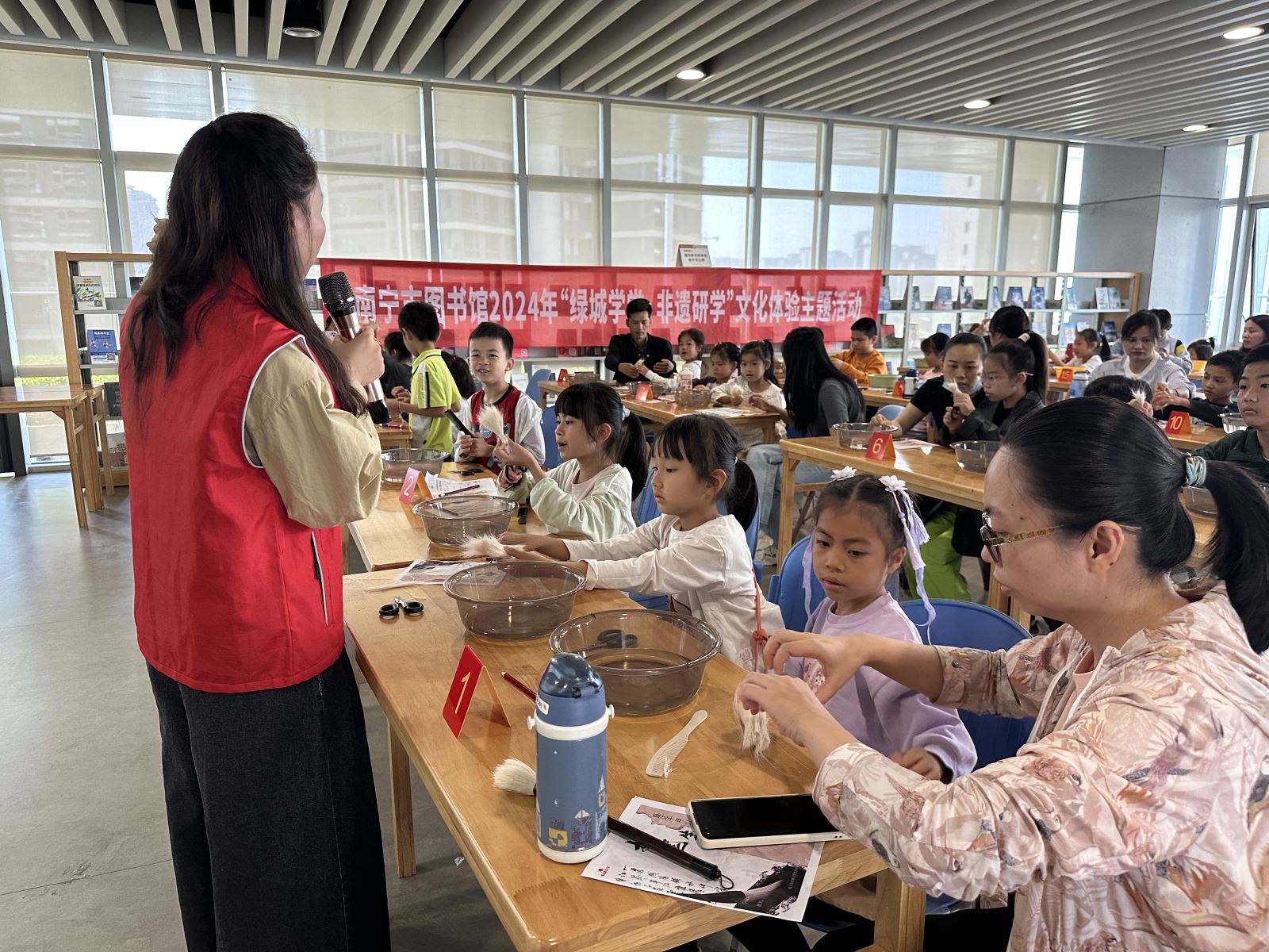 近日,南宁市图书馆“绿城学堂”文化教育活动品牌开启“非遗研学”系列新课程,先后在馆内三楼阅读体验中心举办了“妙笔生花——自治区级非物质文化遗产大罗毛笔”文化体验活动和“一诗一城——领略绿城诗意,感受邕城魅力”文化体验活动,两场活动吸引了80余组家庭约160多人次读者参加。