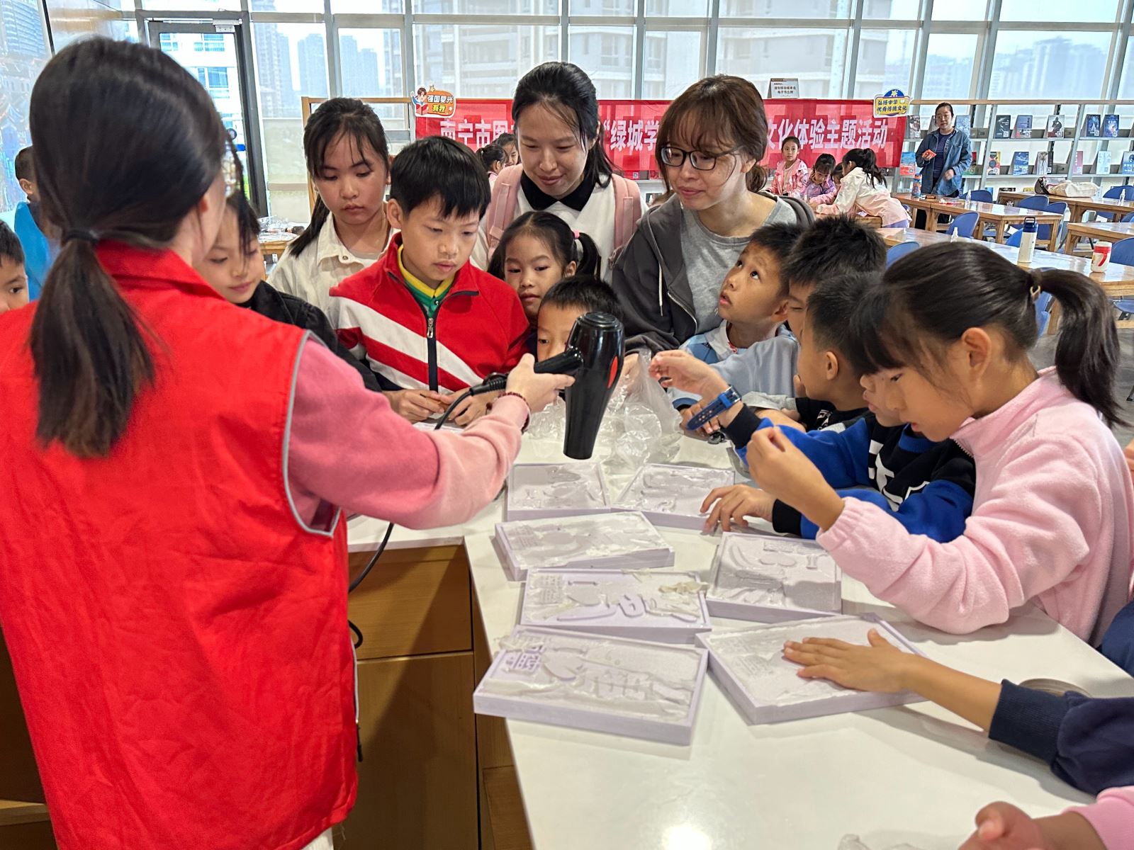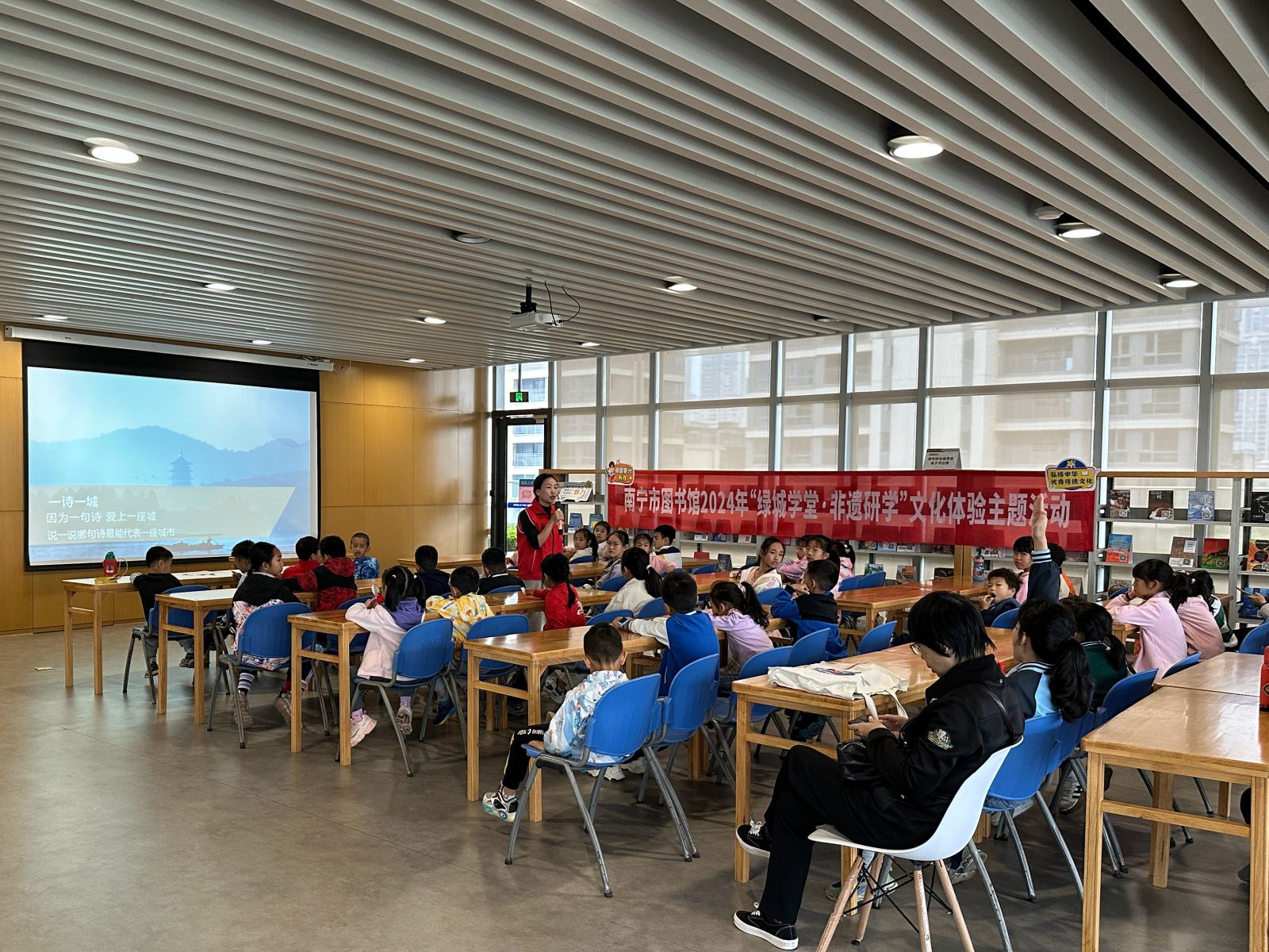 在11月24日举办的“一诗一城——领略绿城诗意,感受邕城魅力”文化体验活动中,通过南宁市图书馆馆藏纸质文本资源,学习与南宁相关的古诗,赏析宋代陶弼的《南宁昆仑关》、明代董传策的《青山歌》、清代黄体元的《邕江杂咏三首》等古诗,感受古代南宁的美丽风光,体会南宁在不同历史时期的风貌和文化氛围。读者们还在研学老师的指导下通过古老技艺雕版印刷的方式拓印古诗词,增强对传统文化非遗技巧的认同感和自豪感。