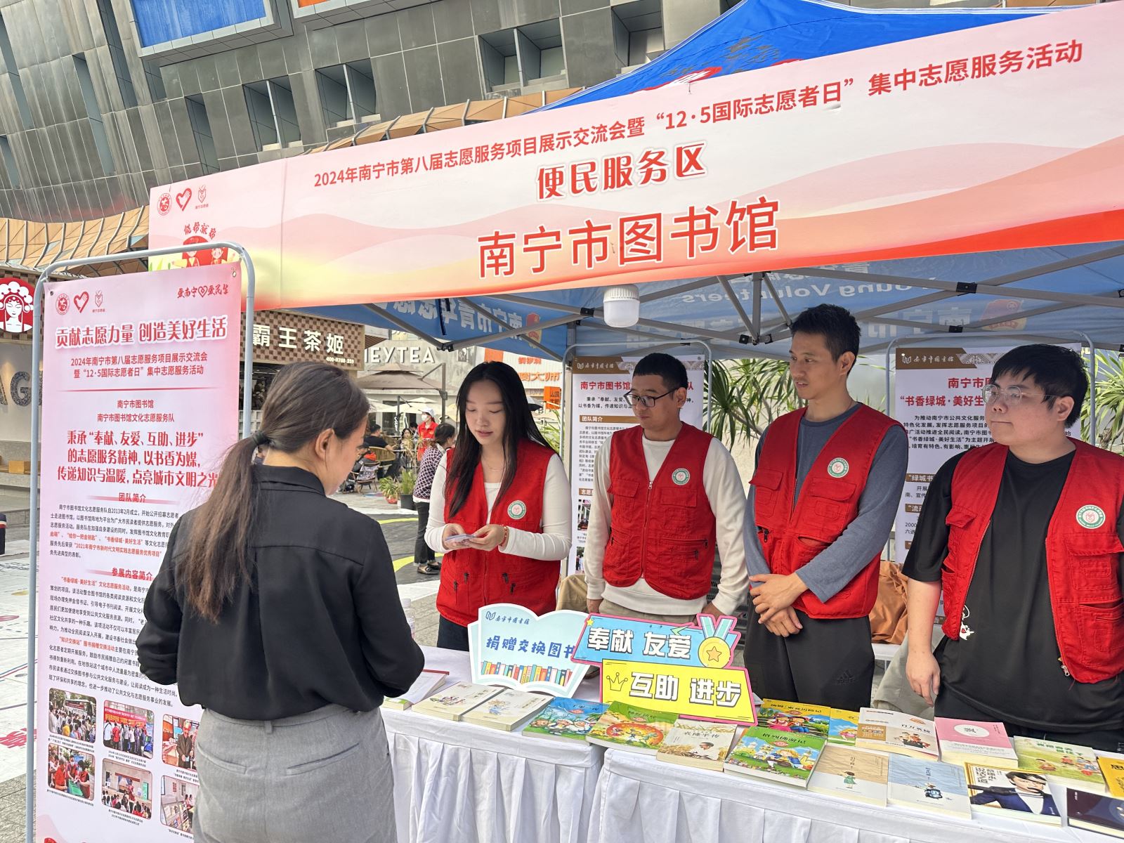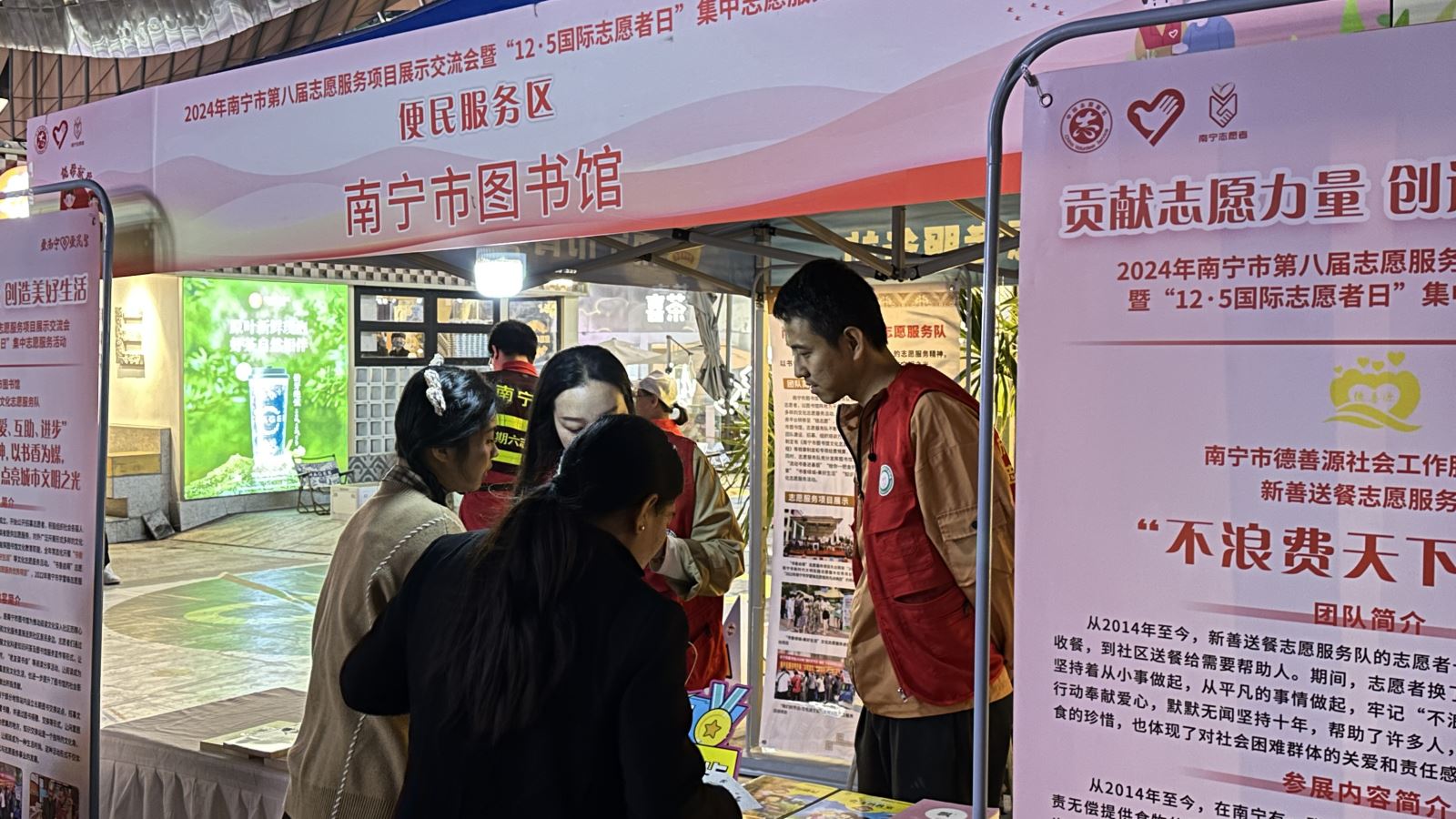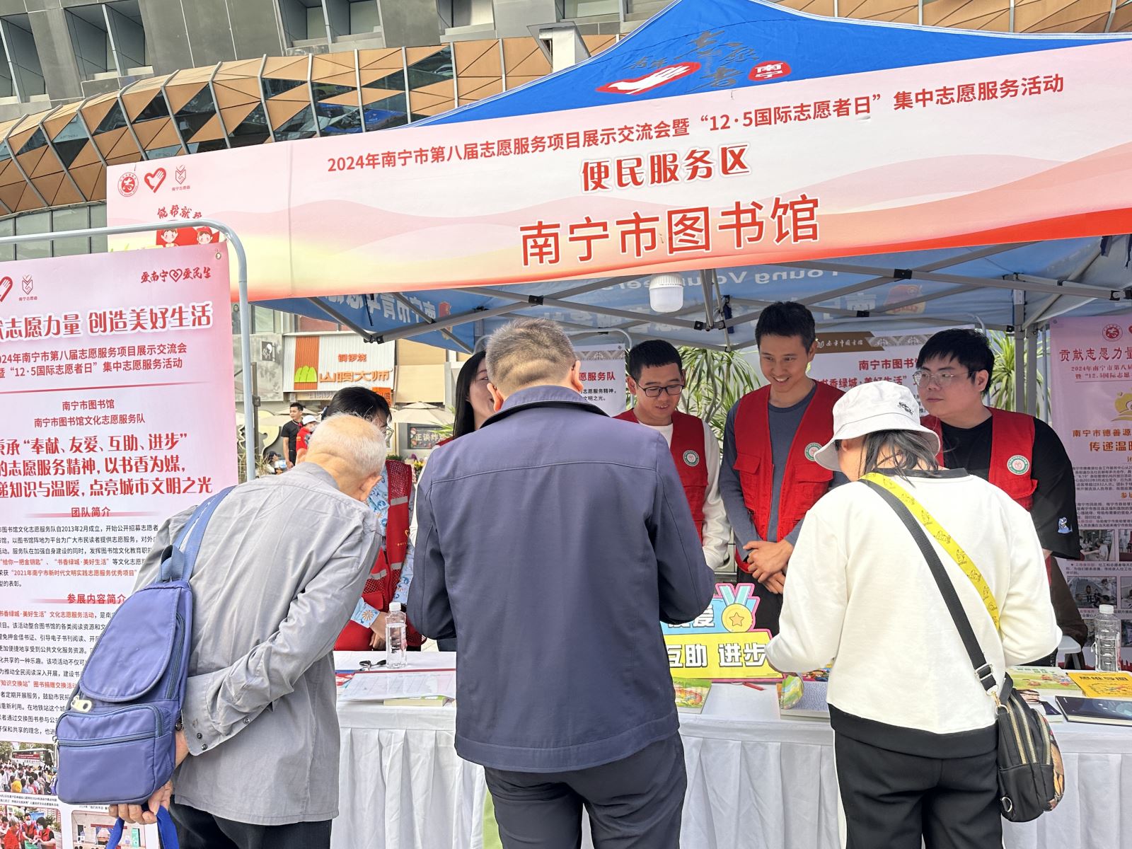 2024年12月5日,由中共南宁市委员会社会工作部、南宁市精神文明建设办公室、共青团南宁市委员会主办,中国民生银行南宁分行、南宁志愿服务联合会、南宁市青年志愿者协会承办的“2024年南宁市第八届志愿服务项目展示交流会暨‘12·5国际志愿者日’集中志愿服务活动”在南宁市青秀区会展航洋城南广场举行,各主办、承办单位领导,各县(市、区)党委社会工作部、团委负责人,各志愿服务组织(团队)、社会组织、新就业群体、高校青年志愿者代表等共300余人参加,南宁市图书馆派出文化志愿队馆员代表参加交流展示。活动以“贡献志愿力量 创造美好生活”为主题,旨在大力弘扬“奉献、友爱、互助、进步”志愿精神,积极培育志愿文化,引导全市志愿服务组织和志愿者发挥积极引领作用,展示南宁市志愿服务工作成果。