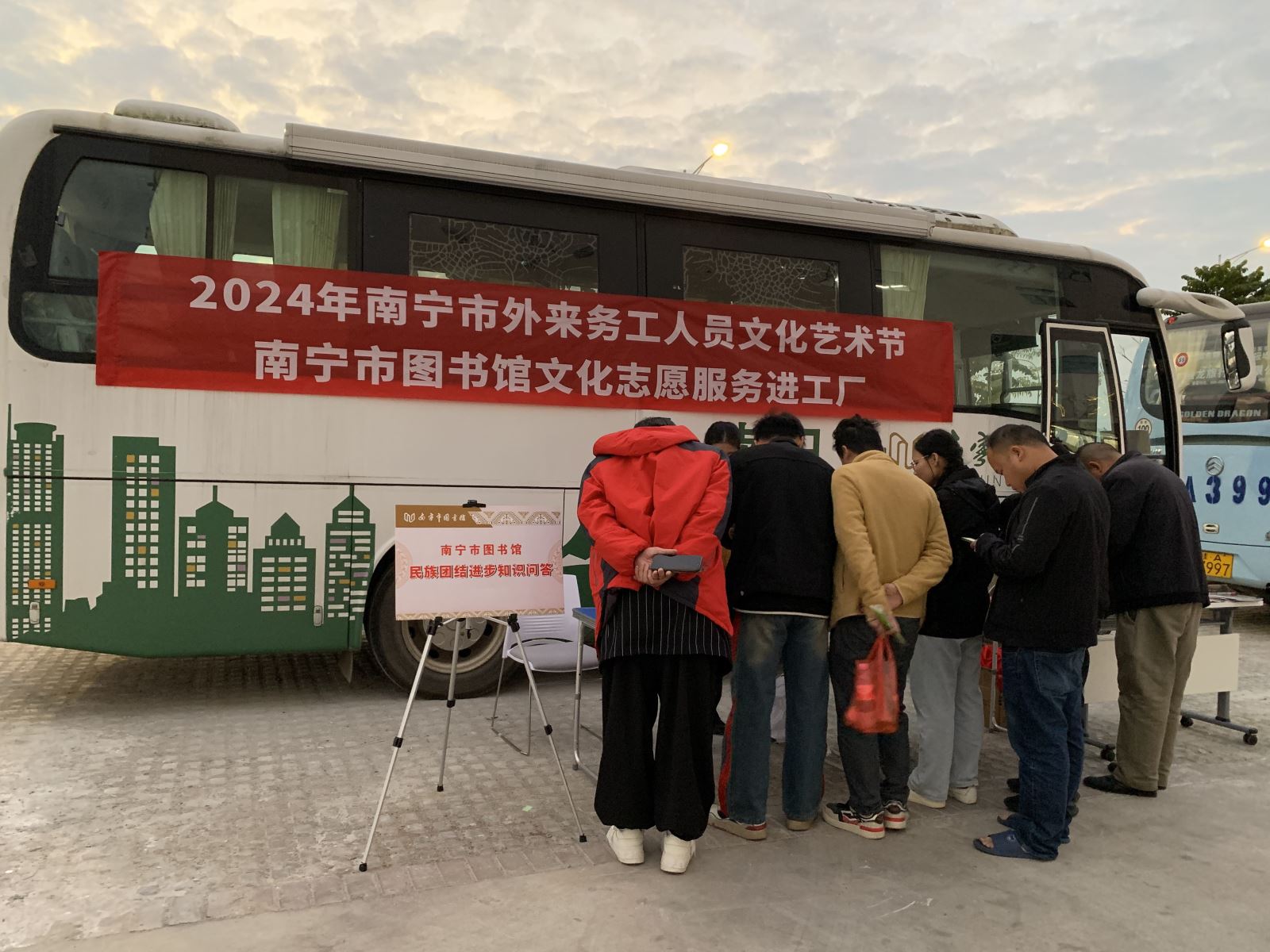 本次活动由南宁市文化广电和旅游局主办,南宁市群众艺术馆承办,南宁市图书馆、南宁市少年儿童图书馆协办。南宁市图书馆文化志愿服务队以走读巴士为载体,现场开展免押金办理借书证、“老友读书会”电子资源荐读、民族团结进步有奖答题、图书漂流、图书馆服务宣传等文化志愿服务活动,这次活动也是南宁市图书馆“书香绿城·美好生活”品牌文化志愿服务活动的第十四期。其中,民族团结进步有奖答题吸引了众多外来务工人员的积极参与,题目涵盖了国家民族政策、民族文化知识等内容,活动现场气氛热烈。寓教于乐的有奖互动问答活动不仅进一步加深了大家对国家民族政策的理解,普及了民族文化知识,还进一步增强了大家对中华民族共同体的历史认同感和情感共鸣。