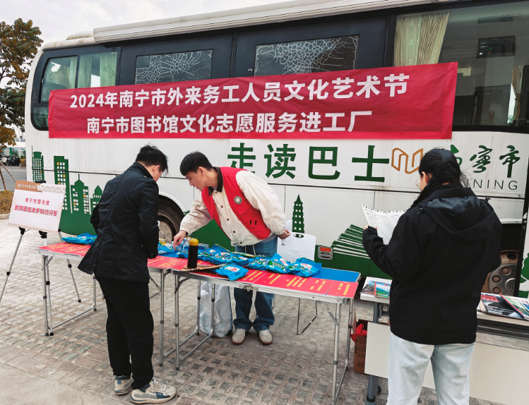 12月14日,南宁市“幸福嘹嘹啰”系列群众文化活动之2024年第19届南宁市外来务工人员文化艺术节专场文艺演出在比亚迪青秀园区举行。南宁市图书馆“走读巴士”开进活动现场,面向厂区外来务工人员开展了形式多样的文化志愿服务进工厂活动。