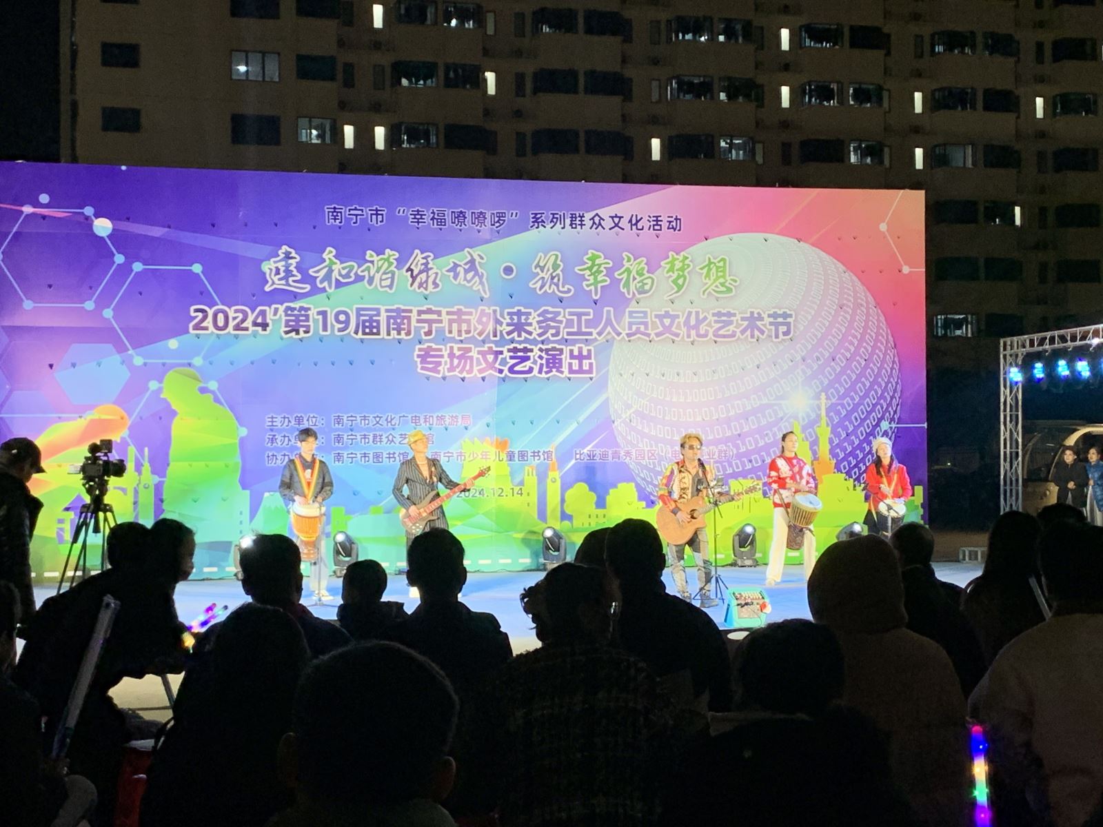 当天活动,南宁市群众艺术馆还为厂区外来务工人员组织了2024年第19届南宁市外来务工人员文化艺术节专场文艺演出。南宁市外来务工人员文化艺术节是南宁市重点打造的文化惠民项目之一,自2004年举办以来为无数怀揣梦想、奋力拼搏的外来务工人员搭台圆梦。为了丰富外来务工人员的精神文化生活,提升他们在这座城市的幸福感、获得感和归属感,增强全社会的凝聚力和向心力生活品质,南宁市图书馆自第一届外来务工文化艺术节便开始参与其中,积极拓宽服务渠道和方式,每年都为广大工友策划精彩的文化主题活动。