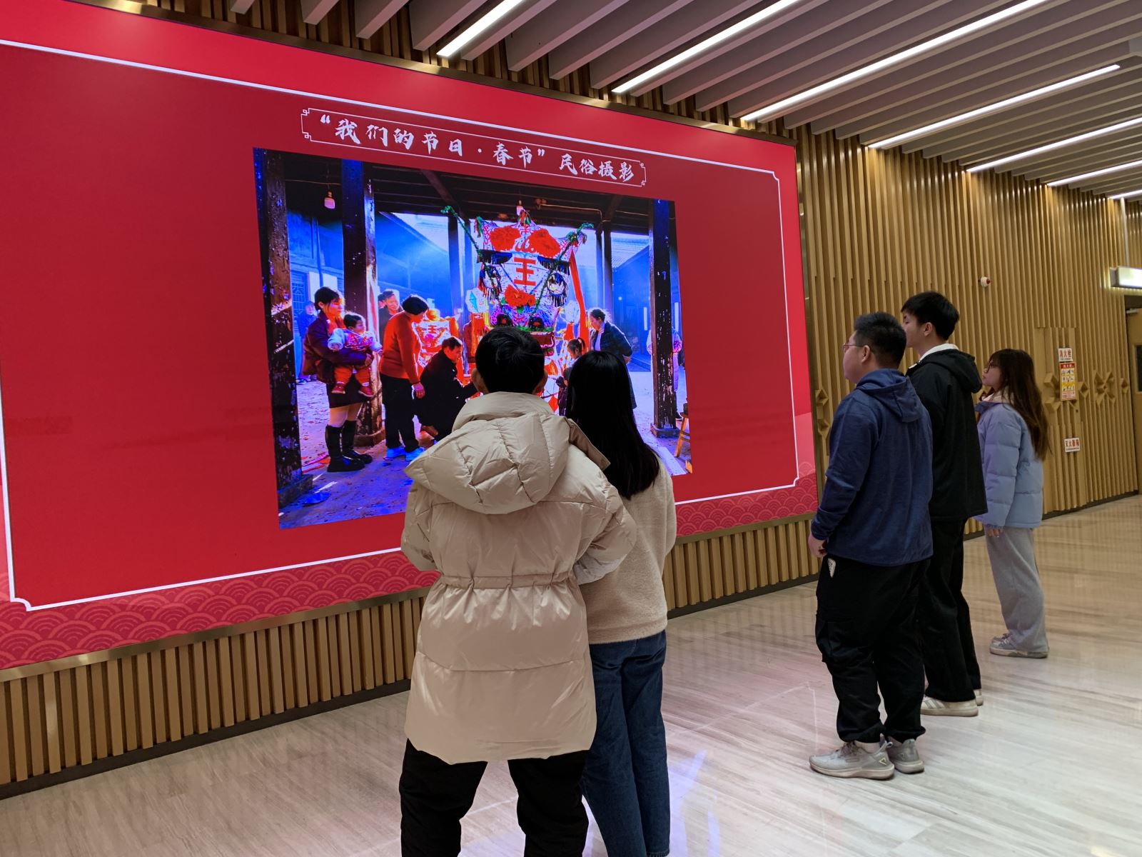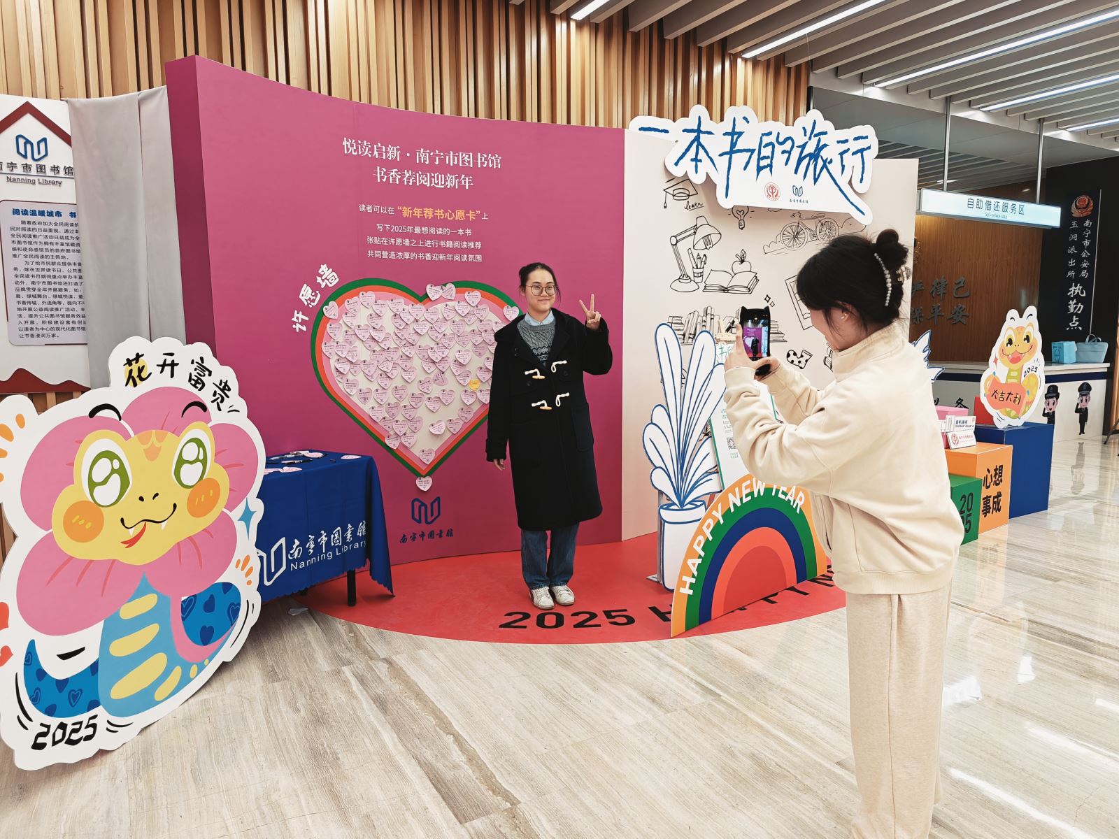 在一楼城市客厅,“从千年灵渠到平陆运河——飞阅平陆运河、环北工程、古桂柳运河及灵渠社科科普巡展(南宁站)”展出378米巨幅展板,带领读者领略古人智慧,展望运河未来;走进二楼读者服务大厅,年味十足的“金蛇献瑞 书香迎春”春节主题美陈映入眼帘,读者可在“书香伴岁长”迎新年转运墙和“博览群书”春联装置等处拍照打卡,还可在读者荐购许愿墙写下新年想看的新书信息,现场“灵蛇献瑞·书香贺岁”谜趣书香展、回望2024年阅读足迹展、“邕城新春·书海领航”新春主题文献书展和国家图书馆春节非遗暨民俗摄影联展视频轮播等展览活动从纸质图书、电子图书、图像等多种文献形态向读者们展示图书馆的文化内涵。